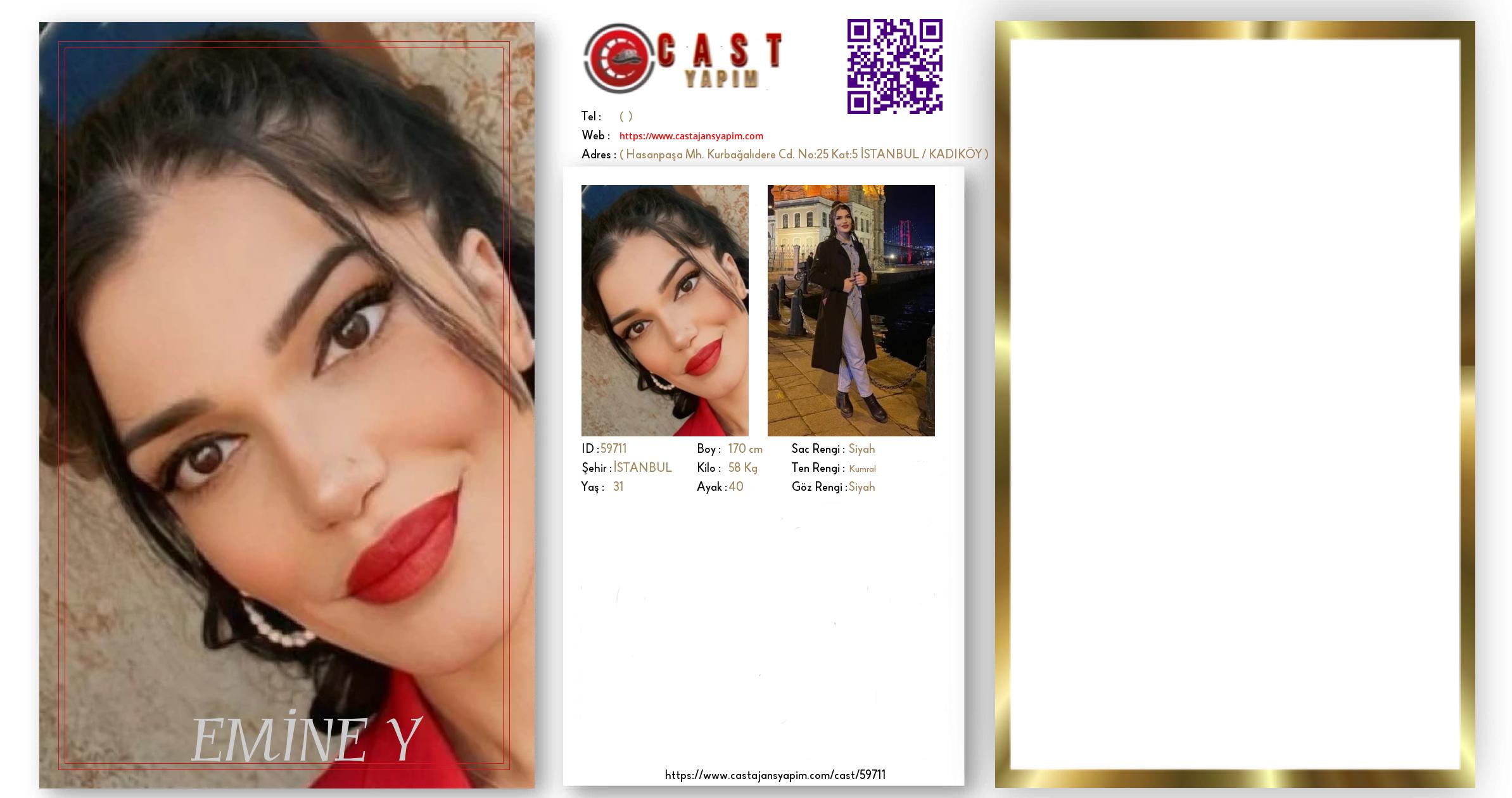 Merhaba, ben EMİNE. İSTANBUL şehrinde yaşıyorum ve 31 yaşındayım. Genel özelliklerim arasında boyum 170 cm, kilom 58 kg, saç rengim Siyah, göz rengim Siyah, ten rengim Kumral.