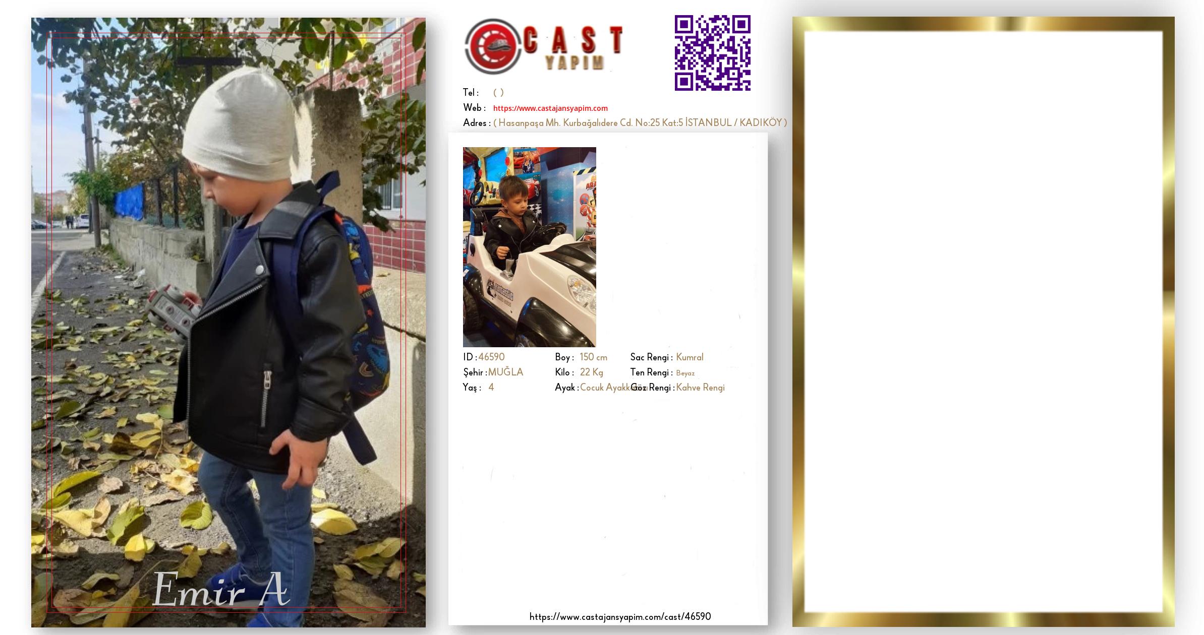 Merhaba, ben Emir. MUĞLA şehrinde yaşıyorum ve 4 yaşındayım. Genel özelliklerim arasında boyum 150 cm, kilom 22 kg, saç rengim Kumral, göz rengim Kahve Rengi, ten rengim Beyaz.