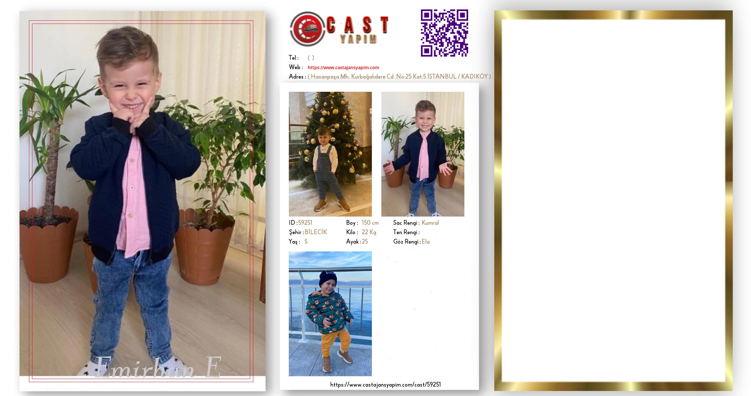 Merhaba, ben Emirhan E. BİLECİK şehrinde yaşıyorum ve 5 yaşındayım. Genel özelliklerim arasında boyum 150 cm, kilom 22 kg, saç rengim Kumral, göz rengim Ela.