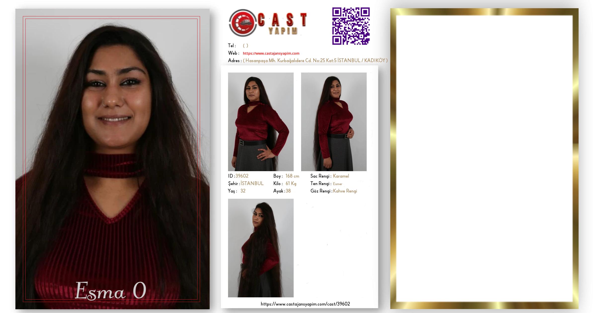 Merhaba, ben Esma. İSTANBUL şehrinde yaşıyorum ve 32 yaşındayım. Genel özelliklerim arasında boyum 168 cm, kilom 61 kg, saç rengim Karamel, göz rengim Kahve Rengi, ten rengim Esmer.