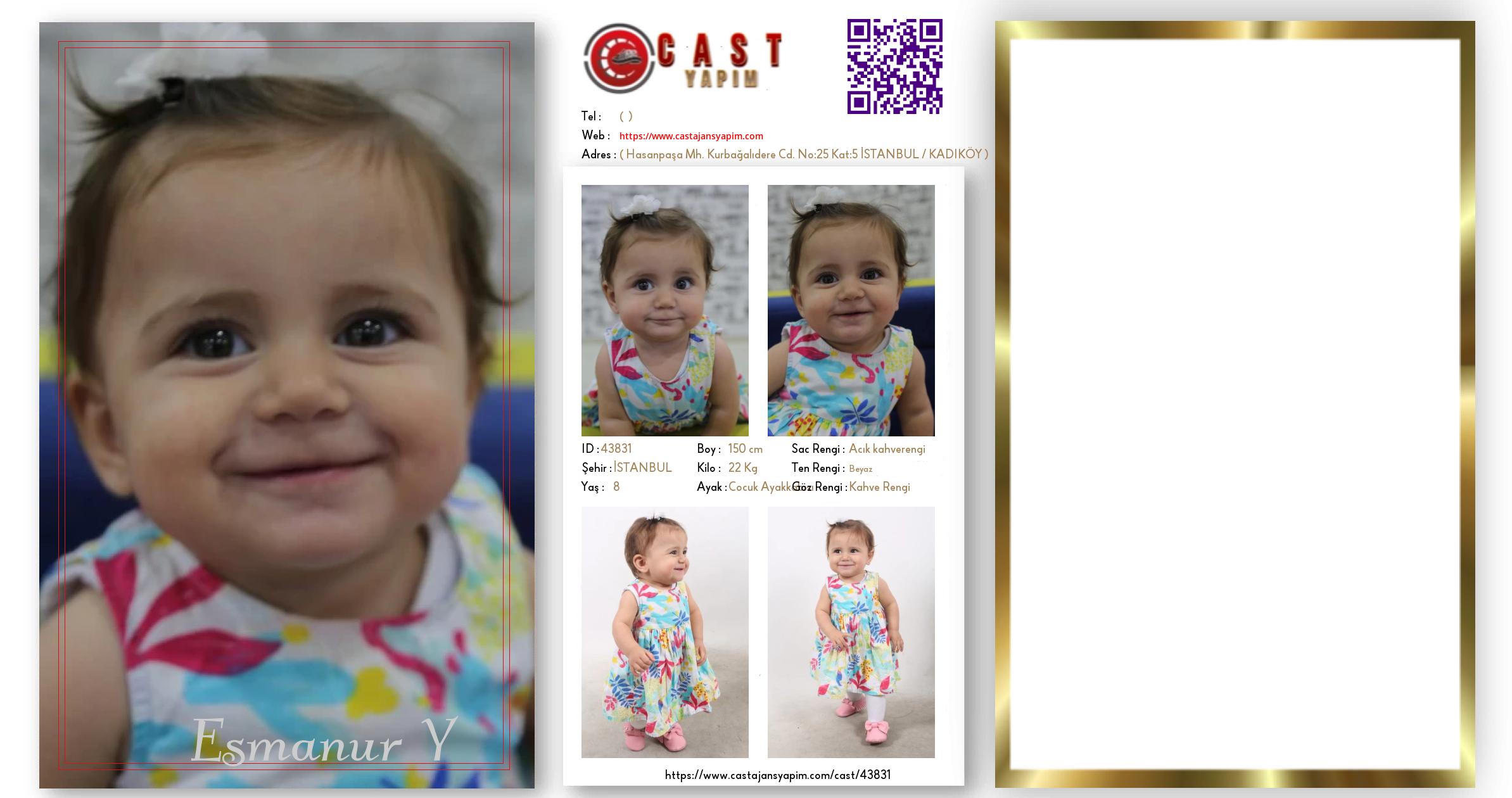 Merhaba, ben Esmanur. İSTANBUL şehrinde yaşıyorum ve 8 yaşındayım. Genel özelliklerim arasında boyum 150 cm, kilom 22 kg, saç rengim Açık kahverengi, göz rengim Kahve Rengi, ten rengim Beyaz.