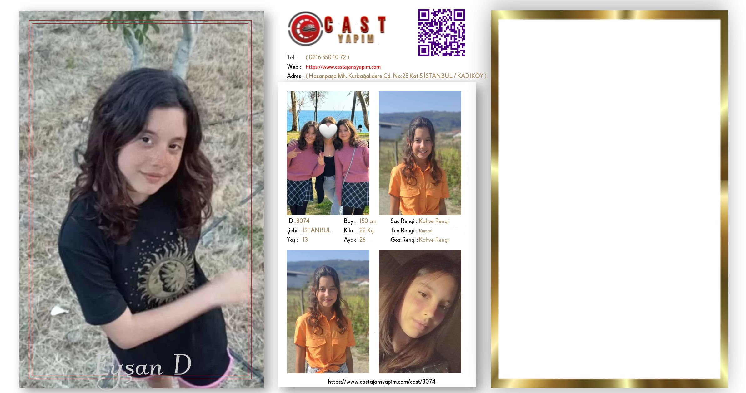 Merhaba, ben Eyşan D. İSTANBUL şehrinde yaşıyorum ve 14 yaşındayım. Genel özelliklerim arasında boyum 150 cm, kilom 22 kg, saç rengim Kahve Rengi, göz rengim Kahve Rengi, ten rengim Kumral.