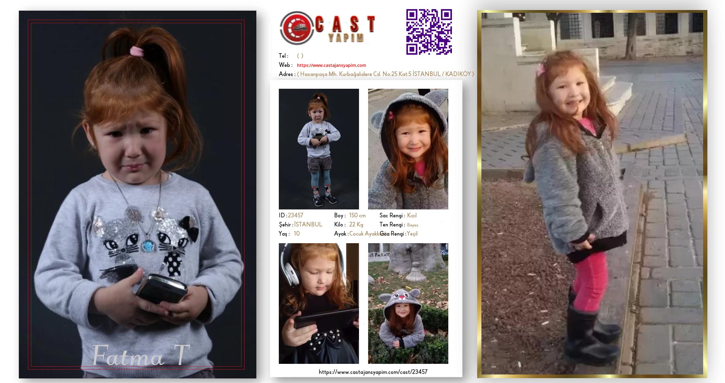 Merhaba, ben Fatma T. İSTANBUL şehrinde yaşıyorum ve 10 yaşındayım. Genel özelliklerim arasında boyum 150 cm, kilom 22 kg, saç rengim Kızıl, göz rengim Yeşil, ten rengim Beyaz.