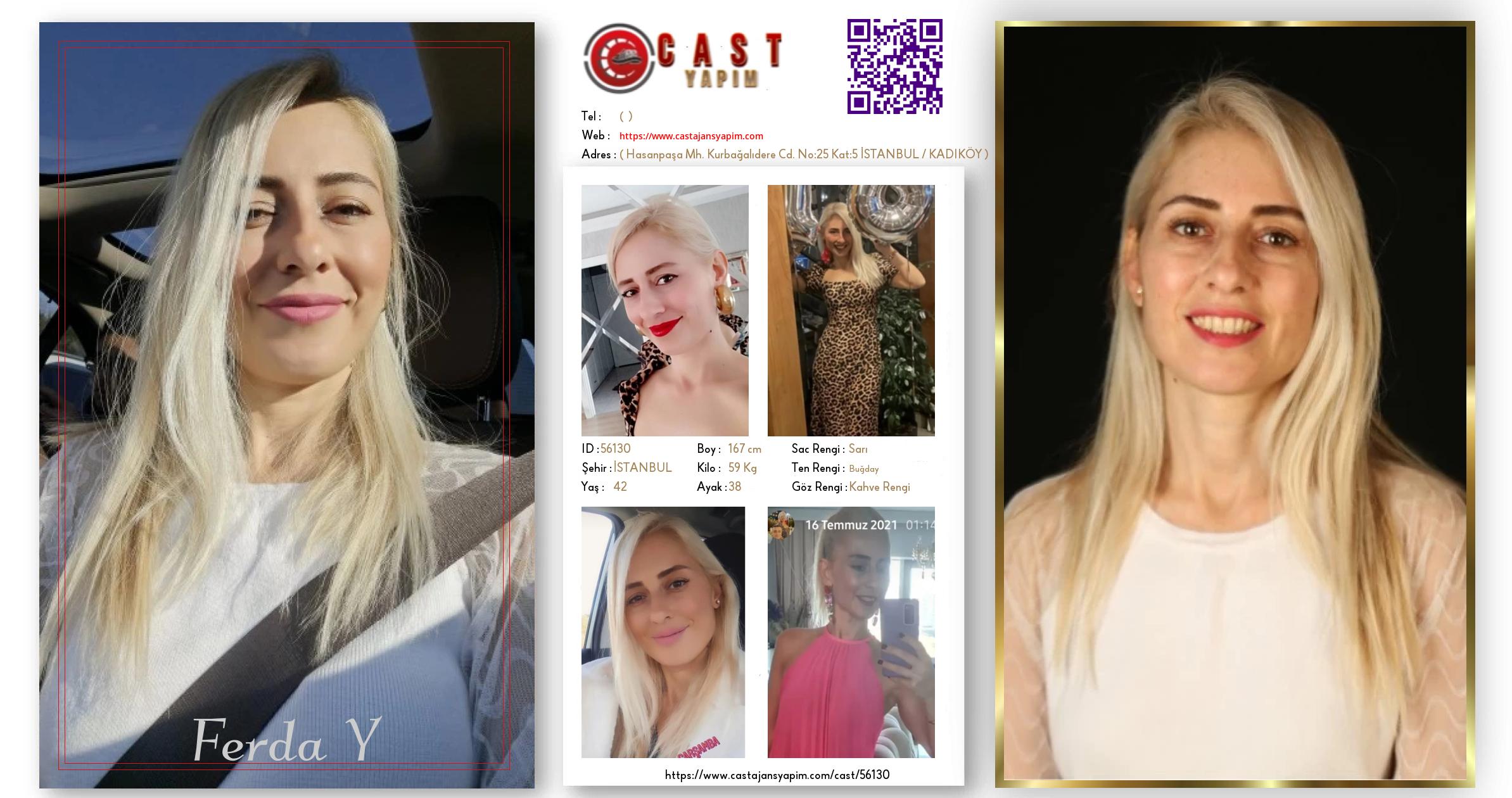 Merhaba, ben Ferda. İSTANBUL şehrinde yaşıyorum ve 42 yaşındayım. Genel özelliklerim arasında boyum 167 cm, kilom 59 kg, saç rengim Sarı, göz rengim Kahve Rengi, ten rengim Buğday.