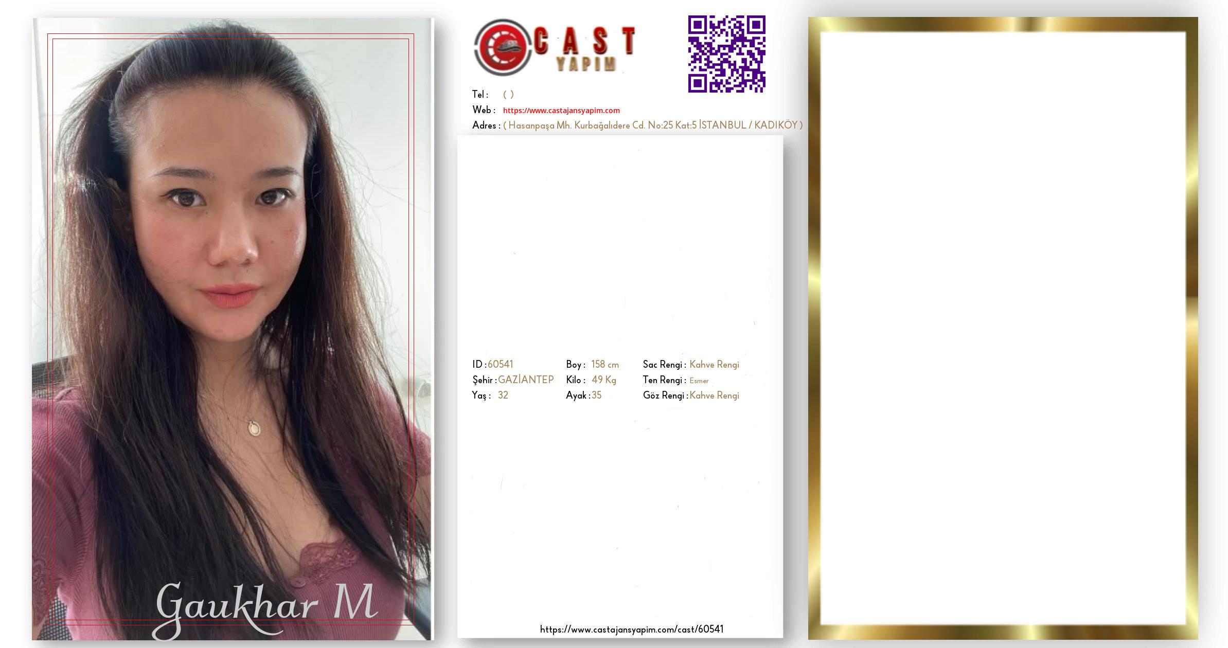 Merhaba, ben Gaukhar. GAZİANTEP şehrinde yaşıyorum ve 32 yaşındayım. Genel özelliklerim arasında boyum 158 cm, kilom 49 kg, saç rengim Kahve Rengi, göz rengim Kahve Rengi, ten rengim Esmer.