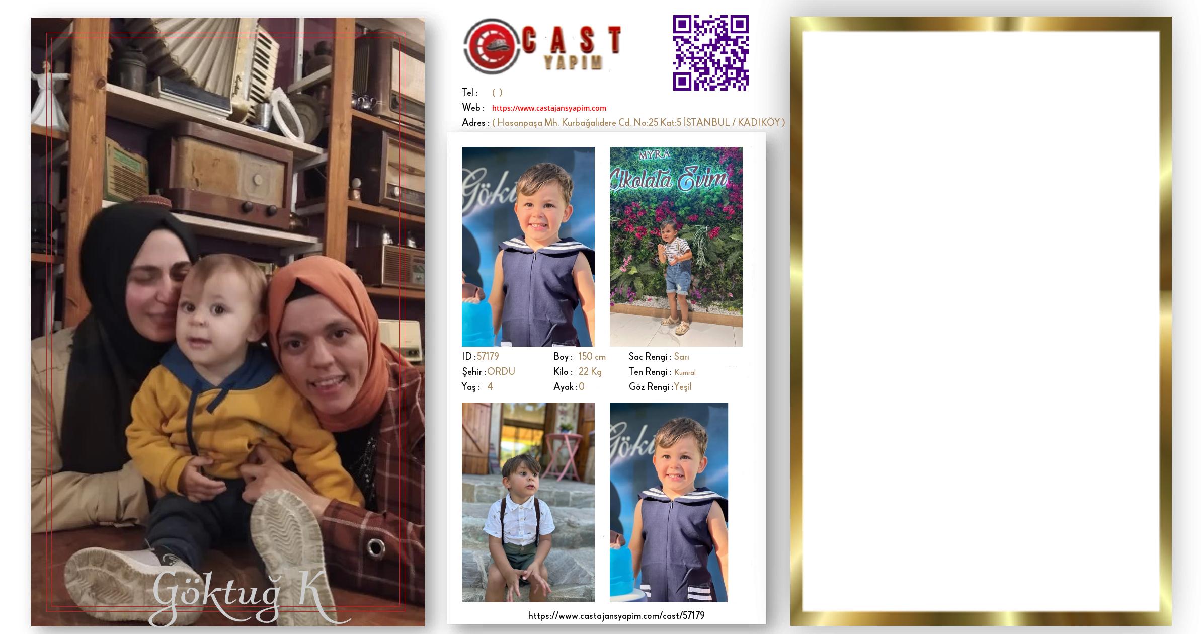 Merhaba, ben Göktuğ. ORDU şehrinde yaşıyorum ve 4 yaşındayım. Genel özelliklerim arasında boyum 150 cm, kilom 22 kg, saç rengim Sarı, göz rengim Yeşil, ten rengim Kumral.