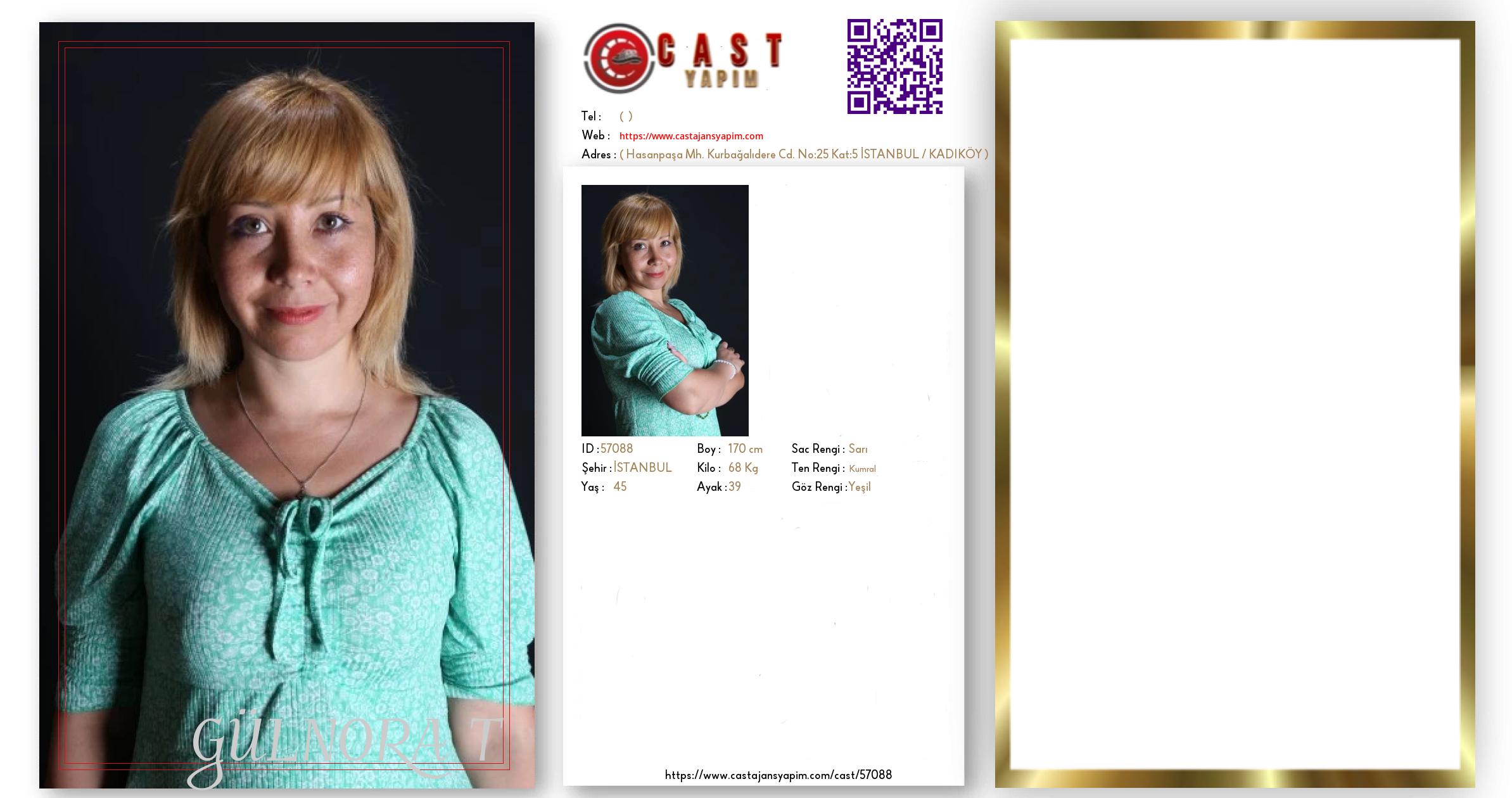Merhaba, ben GÜLNORA. İSTANBUL şehrinde yaşıyorum ve 45 yaşındayım. Genel özelliklerim arasında boyum 170 cm, kilom 68 kg, saç rengim Sarı, göz rengim Yeşil, ten rengim Kumral.