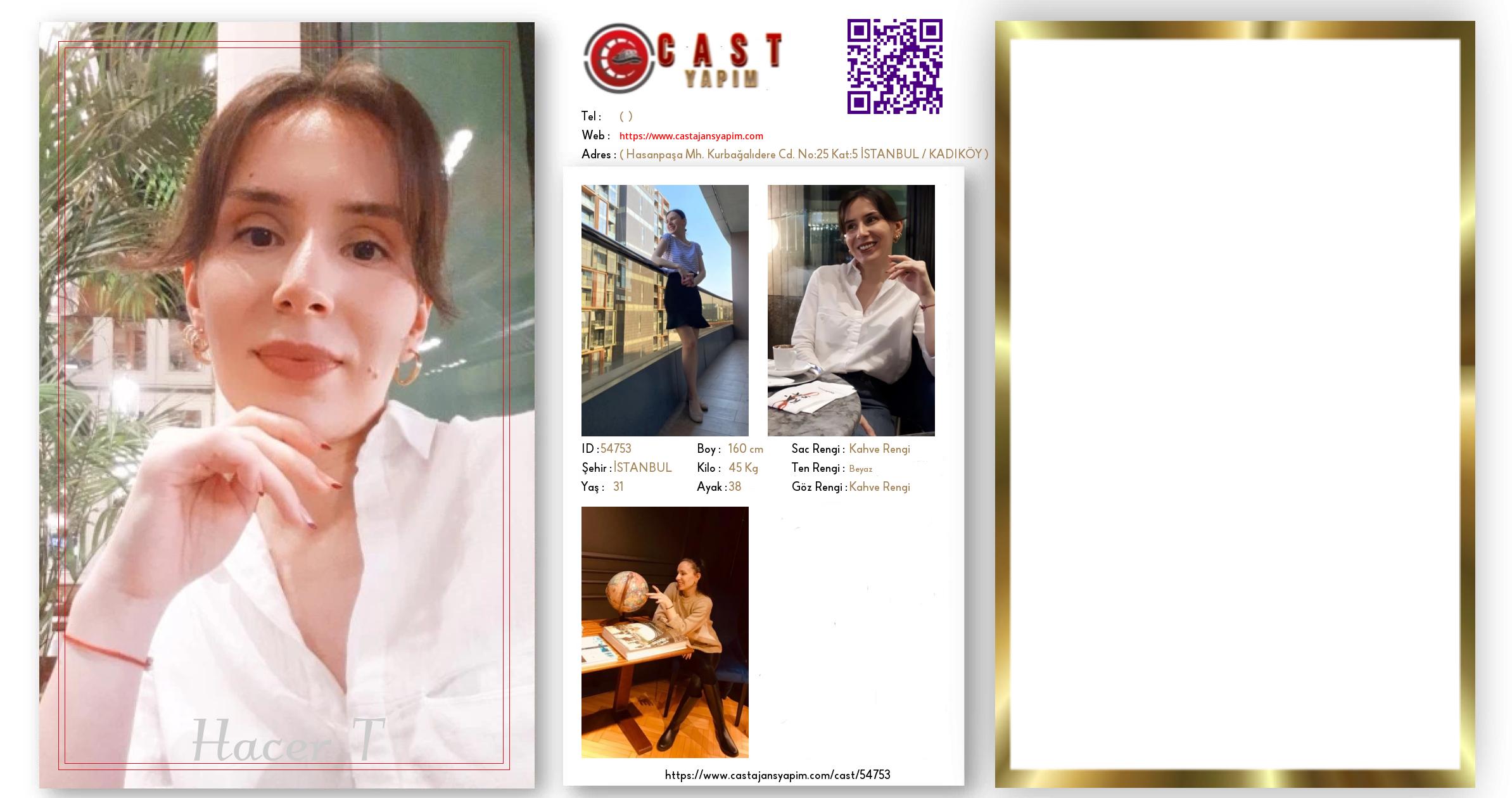 Merhaba, ben Hacer. İSTANBUL şehrinde yaşıyorum ve 31 yaşındayım. Genel özelliklerim arasında boyum 160 cm, kilom 45 kg, saç rengim Kahve Rengi, göz rengim Kahve Rengi, ten rengim Beyaz.