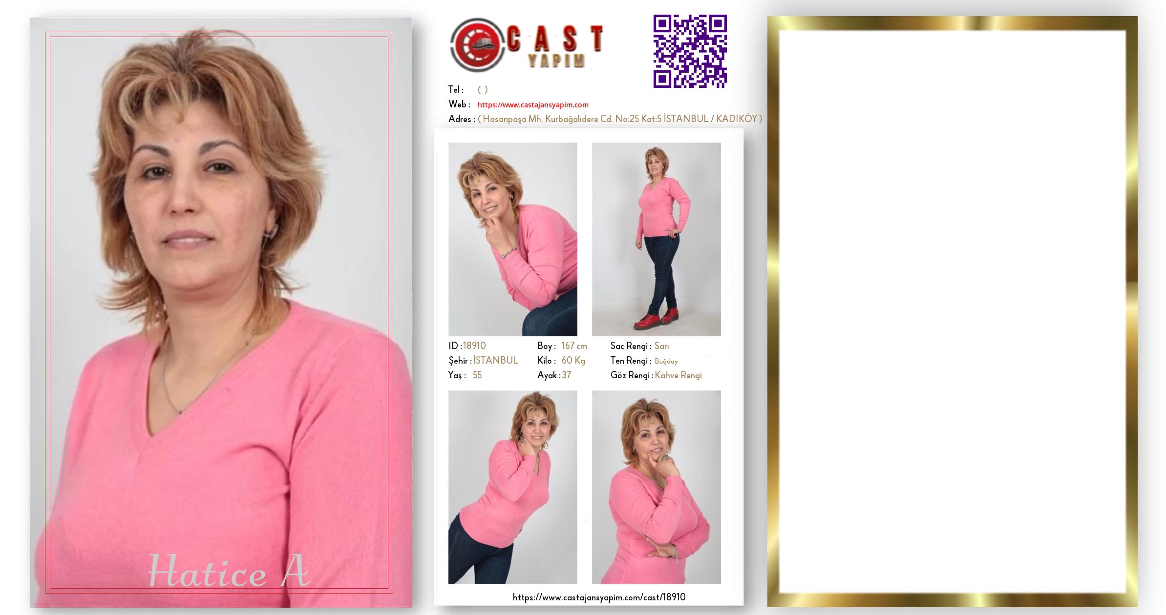 Merhaba, ben Hatice A. İSTANBUL şehrinde yaşıyorum ve 55 yaşındayım. Genel özelliklerim arasında boyum 167 cm, kilom 60 kg, saç rengim Sarı, göz rengim Kahve Rengi, ten rengim Buğday.