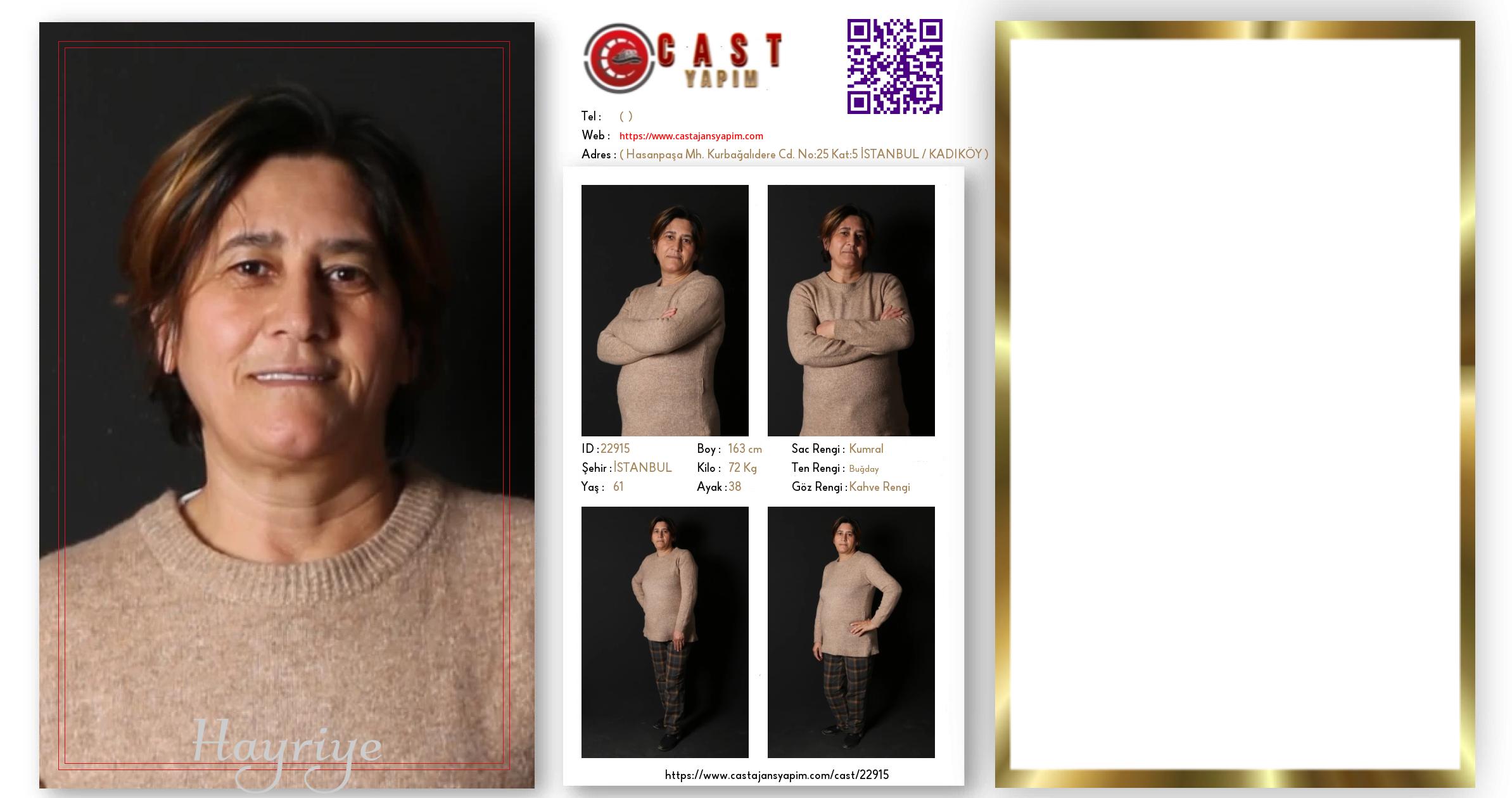Merhaba, ben Hayriye. İSTANBUL şehrinde yaşıyorum ve 61 yaşındayım. Genel özelliklerim arasında boyum 163 cm, kilom 72 kg, saç rengim Kumral, göz rengim Kahve Rengi, ten rengim Buğday.