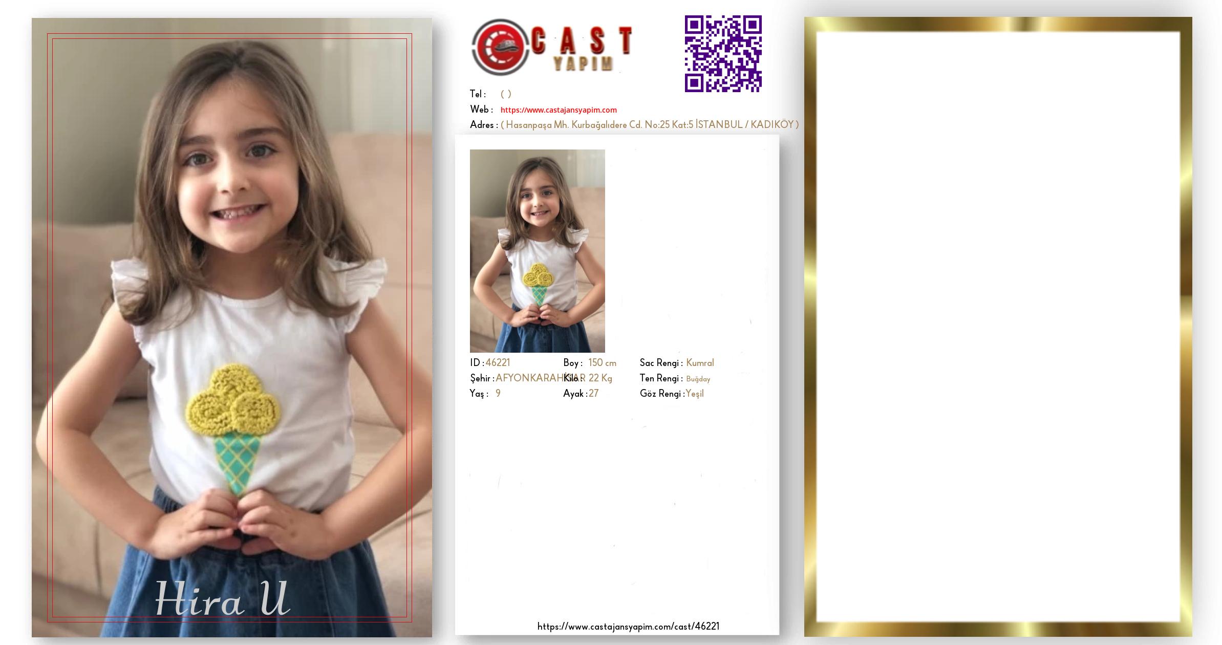 Merhaba, ben Hira U. AFYONKARAHİSAR şehrinde yaşıyorum ve 9 yaşındayım. Genel özelliklerim arasında boyum 150 cm, kilom 22 kg, saç rengim Kumral, göz rengim Yeşil, ten rengim Buğday.