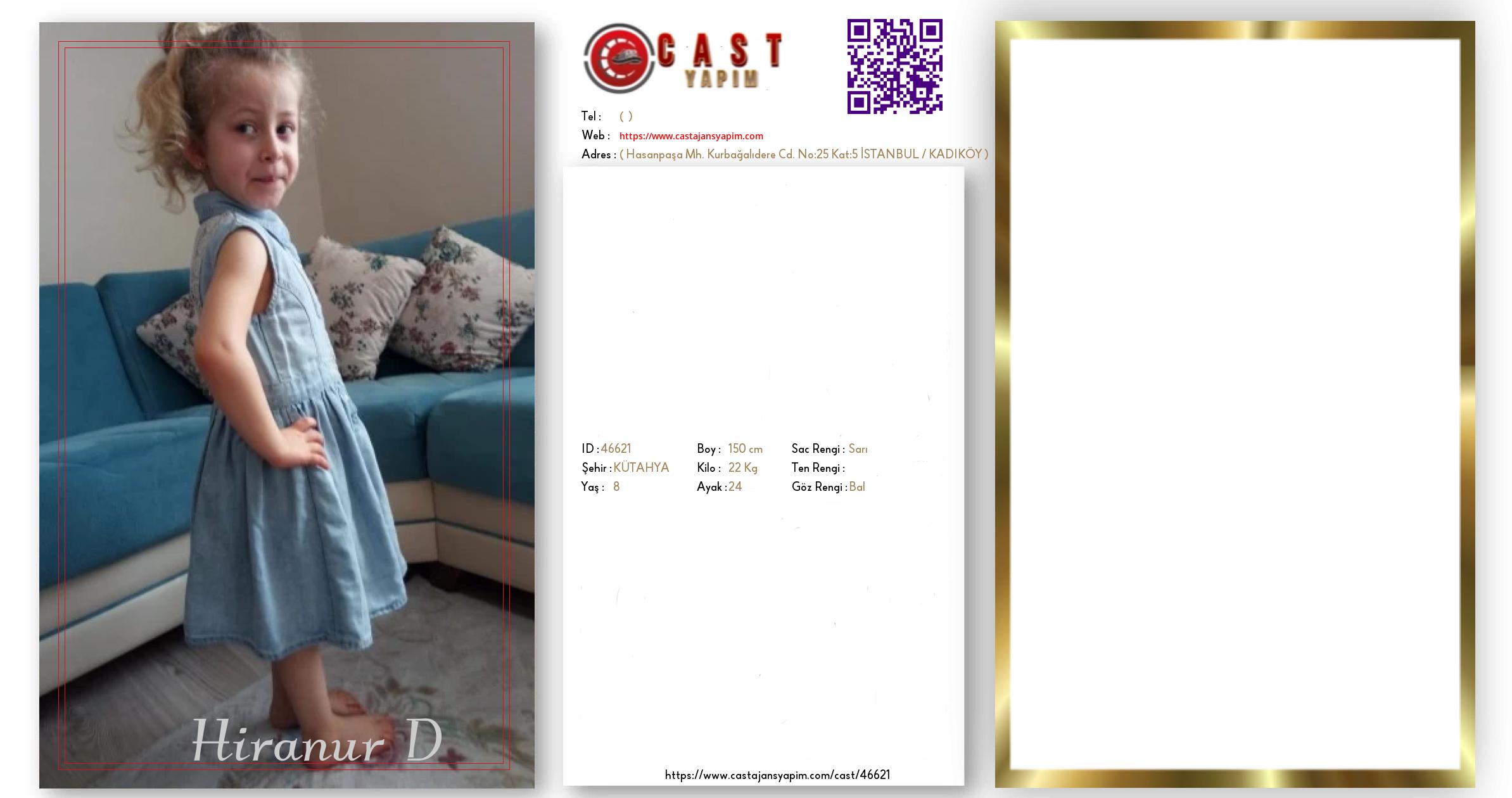 Merhaba, ben Hiranur. KÜTAHYA şehrinde yaşıyorum ve 8 yaşındayım. Genel özelliklerim arasında boyum 150 cm, kilom 22 kg, saç rengim Sarı, göz rengim Bal.