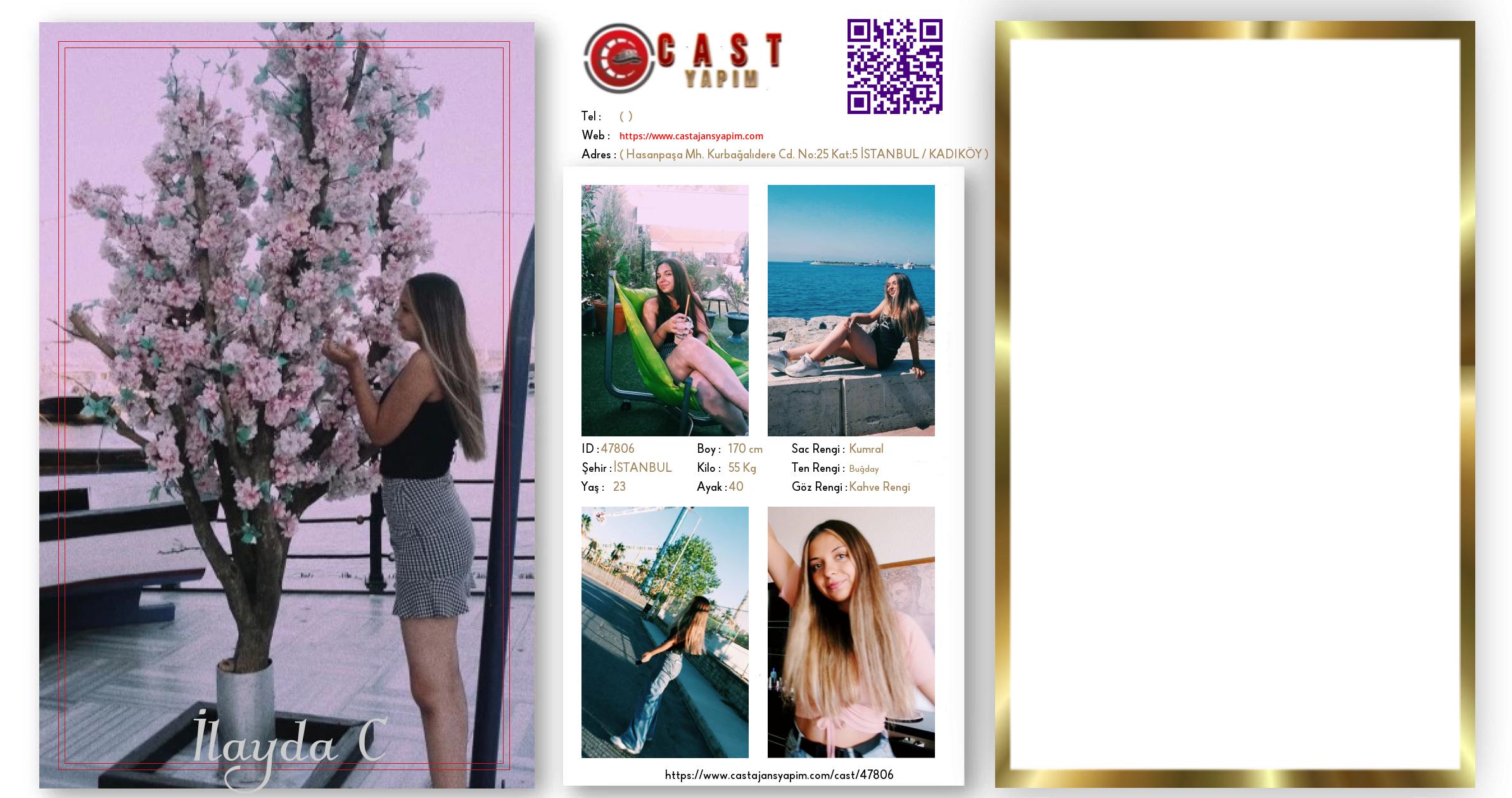 Merhaba, ben İlayda C. İSTANBUL şehrinde yaşıyorum ve 23 yaşındayım. Genel özelliklerim arasında boyum 170 cm, kilom 55 kg, saç rengim Kumral, göz rengim Kahve Rengi, ten rengim Buğday.