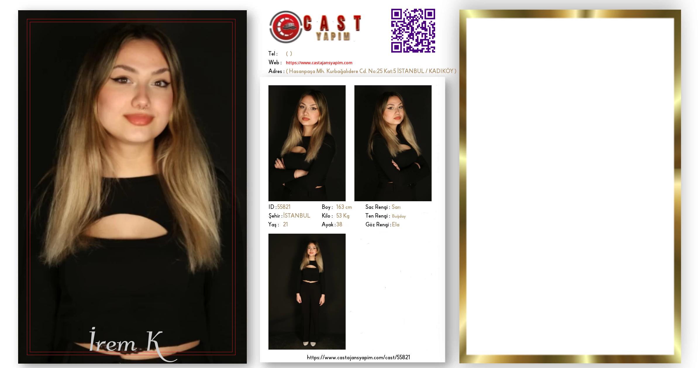 Merhaba, ben İrem. İSTANBUL şehrinde yaşıyorum ve 21 yaşındayım. Genel özelliklerim arasında boyum 163 cm, kilom 53 kg, saç rengim Sarı, göz rengim Ela, ten rengim Buğday.