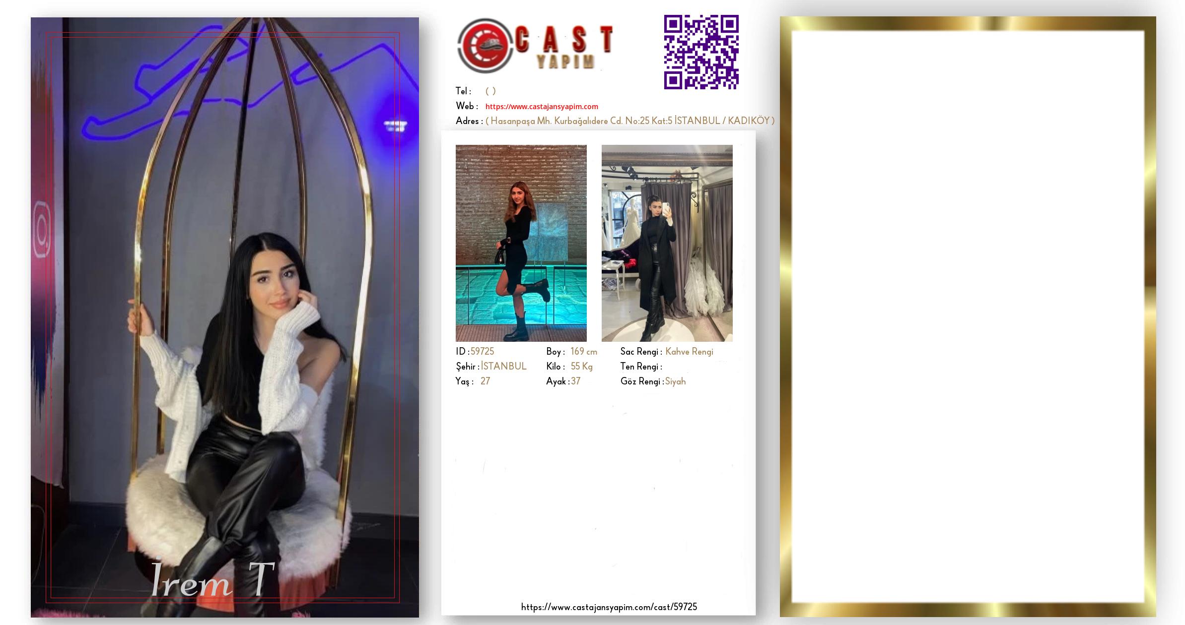 Merhaba, ben İrem. İSTANBUL şehrinde yaşıyorum ve 27 yaşındayım. Genel özelliklerim arasında boyum 169 cm, kilom 55 kg, saç rengim Kahve Rengi, göz rengim Siyah.