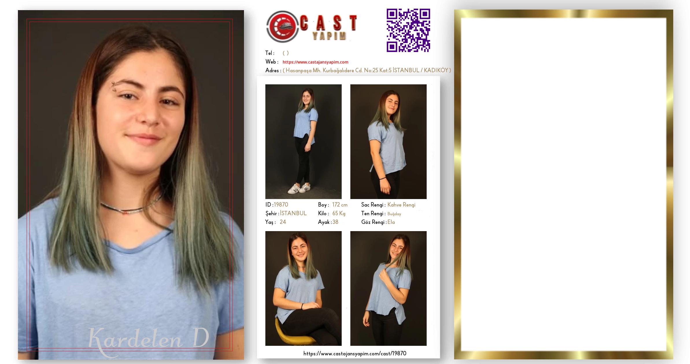Merhaba, ben Kardelen. İSTANBUL şehrinde yaşıyorum ve 24 yaşındayım. Genel özelliklerim arasında boyum 172 cm, kilom 65 kg, saç rengim Kahve Rengi, göz rengim Ela, ten rengim Buğday.