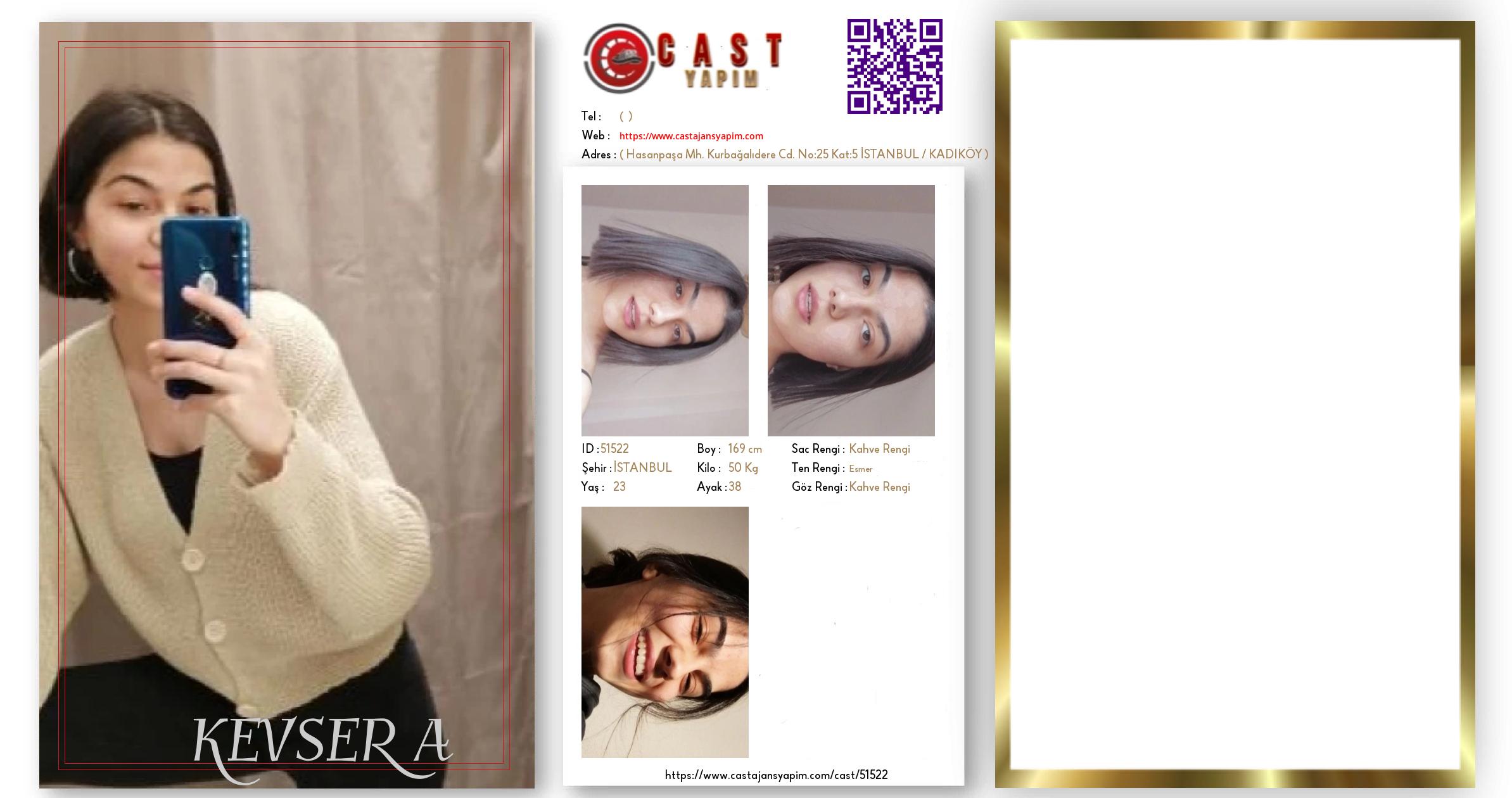 Merhaba, ben KEVSER A. İSTANBUL şehrinde yaşıyorum ve 23 yaşındayım. Genel özelliklerim arasında boyum 169 cm, kilom 50 kg, saç rengim Kahve Rengi, göz rengim Kahve Rengi, ten rengim Esmer.