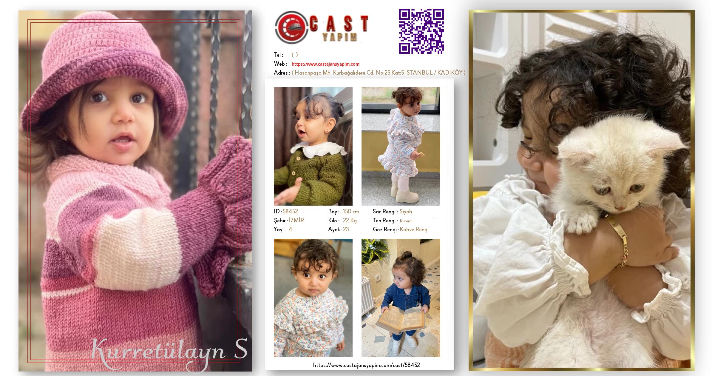 Merhaba, ben Kurretülayn. İZMİR şehrinde yaşıyorum ve 4 yaşındayım. Genel özelliklerim arasında boyum 150 cm, kilom 22 kg, saç rengim Siyah, göz rengim Kahve Rengi, ten rengim Kumral.