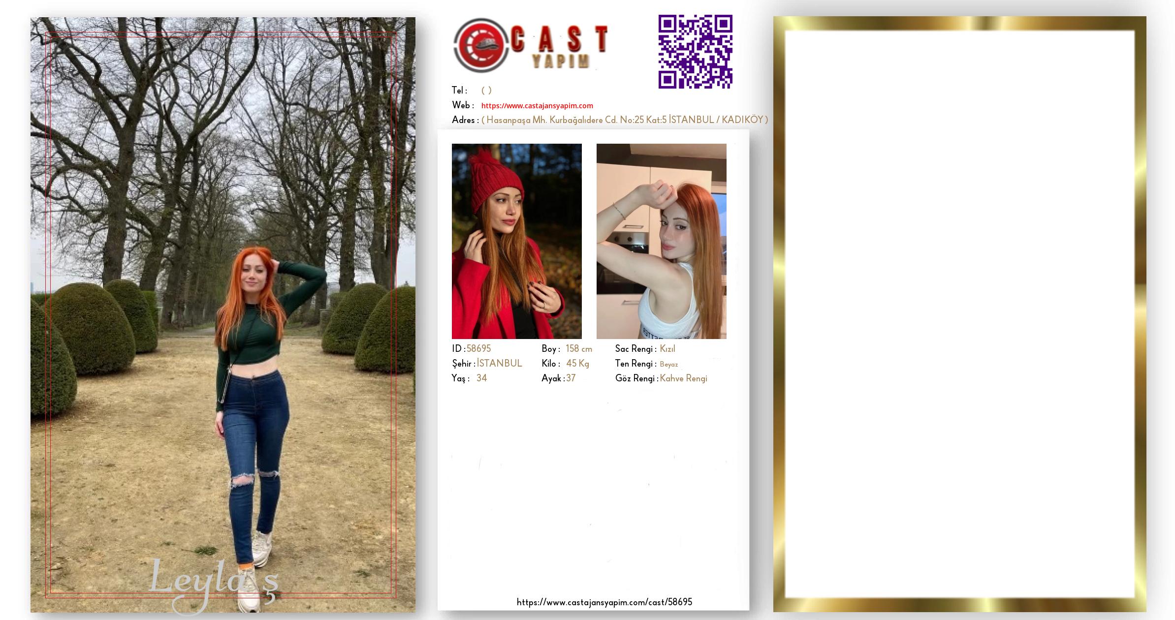 Merhaba, ben Leyla. İSTANBUL şehrinde yaşıyorum ve 34 yaşındayım. Genel özelliklerim arasında boyum 158 cm, kilom 45 kg, saç rengim Kızıl, göz rengim Kahve Rengi, ten rengim Beyaz.