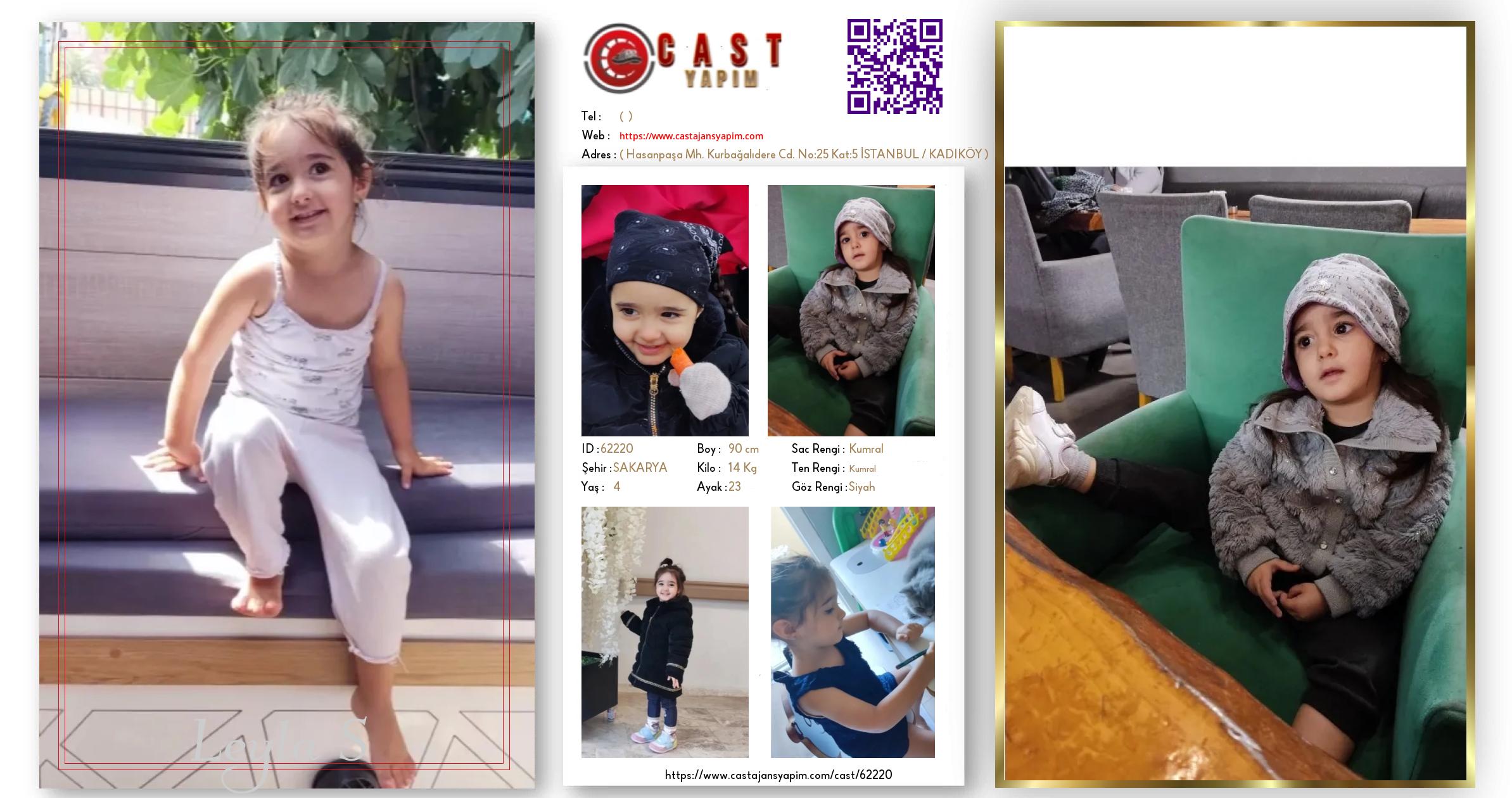 Merhaba, ben Leyla Ada. SAKARYA şehrinde yaşıyorum ve 4 yaşındayım. Genel özelliklerim arasında boyum 90 cm, kilom 14 kg, saç rengim Kumral, göz rengim Siyah, ten rengim Kumral.