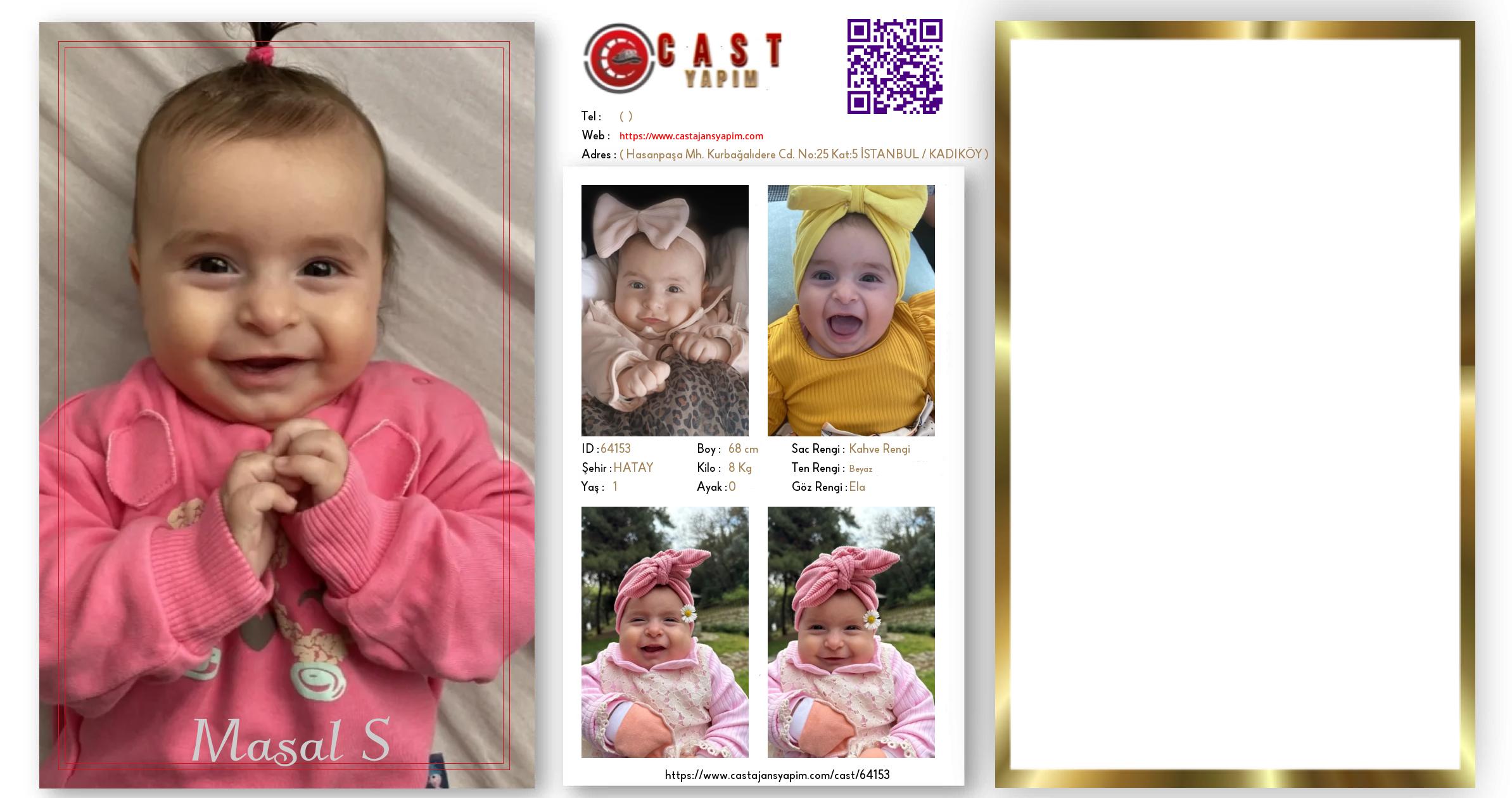 Merhaba, ben Masal S. HATAY şehrinde yaşıyorum ve 1 yaşındayım. Genel özelliklerim arasında boyum 68 cm, kilom 8 kg, saç rengim Kahve Rengi, göz rengim Ela, ten rengim Beyaz.