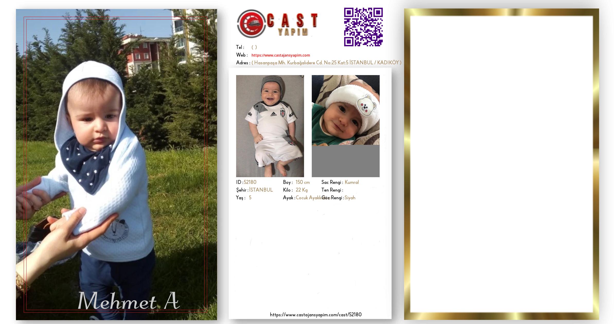 Merhaba, ben Mehmet Aras. İSTANBUL şehrinde yaşıyorum ve 5 yaşındayım. Genel özelliklerim arasında boyum 150 cm, kilom 22 kg, saç rengim Kumral, göz rengim Siyah.