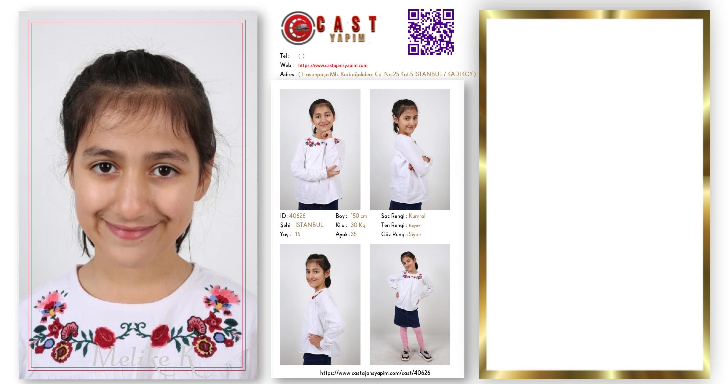 Merhaba, ben Melike K. İSTANBUL şehrinde yaşıyorum ve 16 yaşındayım. Genel özelliklerim arasında boyum 150 cm, kilom 30 kg, saç rengim Kumral, göz rengim Siyah, ten rengim Beyaz.