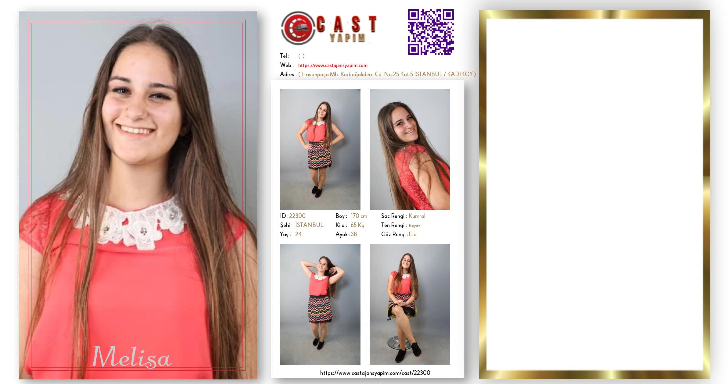 Merhaba, ben Melisa . İSTANBUL şehrinde yaşıyorum ve 24 yaşındayım. Genel özelliklerim arasında boyum 170 cm, kilom 65 kg, saç rengim Kumral, göz rengim Ela, ten rengim Beyaz.