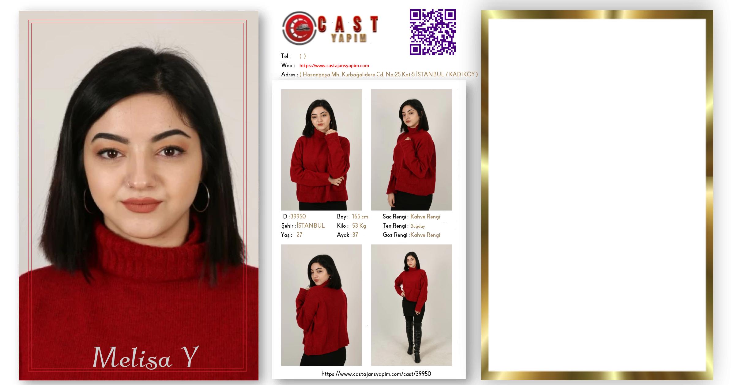 Merhaba, ben Melisa. İSTANBUL şehrinde yaşıyorum ve 27 yaşındayım. Genel özelliklerim arasında boyum 165 cm, kilom 53 kg, saç rengim Kahve Rengi, göz rengim Kahve Rengi, ten rengim Buğday.