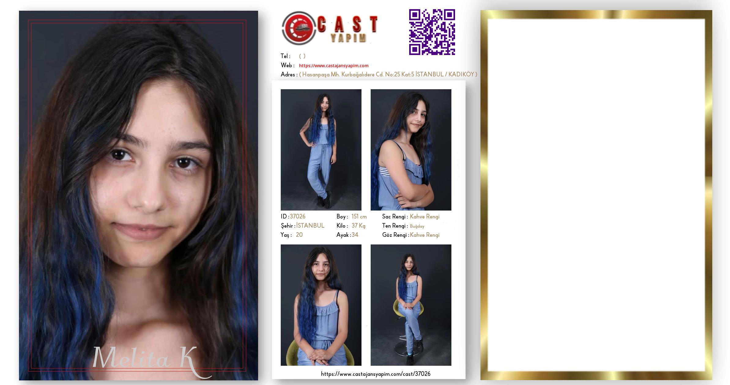 Merhaba, ben Melita Kardelen. İSTANBUL şehrinde yaşıyorum ve 20 yaşındayım. Genel özelliklerim arasında boyum 151 cm, kilom 37 kg, saç rengim Kahve Rengi, göz rengim Kahve Rengi, ten rengim Buğday.