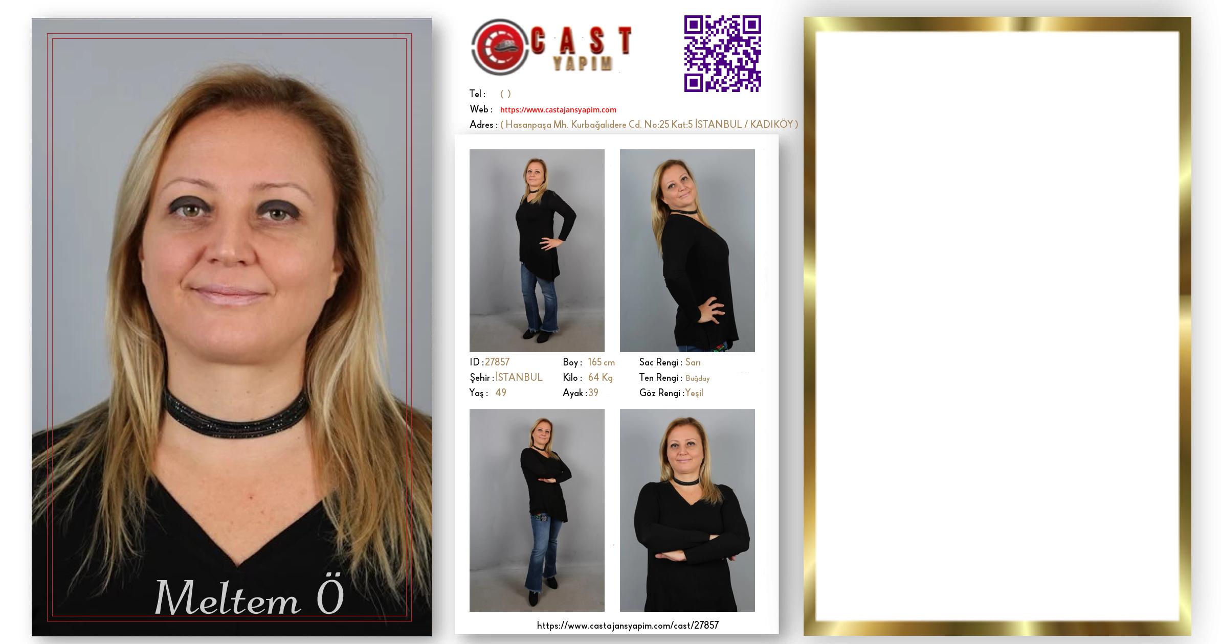Merhaba, ben Meltem. İSTANBUL şehrinde yaşıyorum ve 49 yaşındayım. Genel özelliklerim arasında boyum 165 cm, kilom 64 kg, saç rengim Sarı, göz rengim Yeşil, ten rengim Buğday.