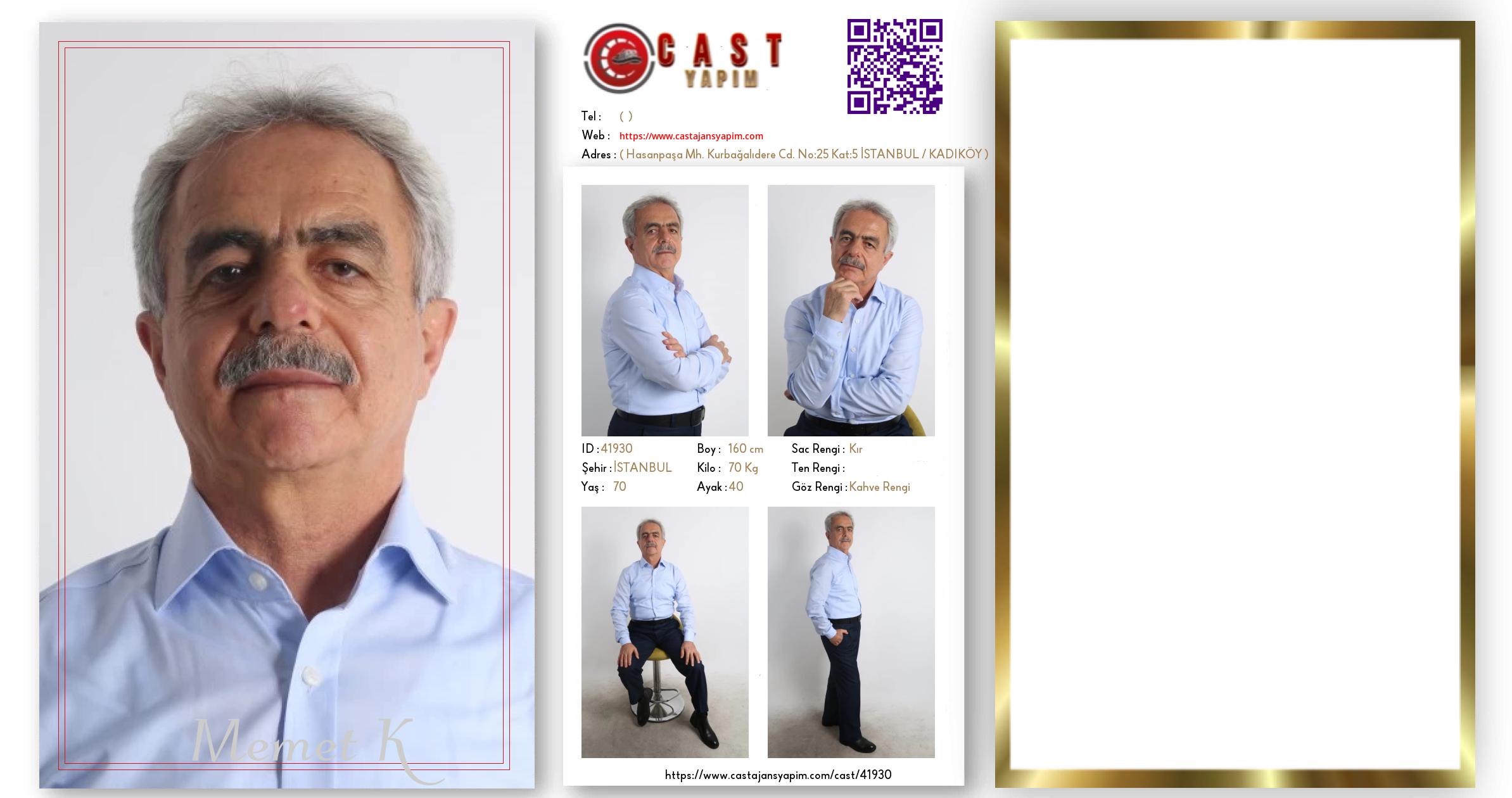Merhaba, ben Memet Şahdan. İSTANBUL şehrinde yaşıyorum ve 70 yaşındayım. Genel özelliklerim arasında boyum 160 cm, kilom 70 kg, saç rengim Kır, göz rengim Kahve Rengi.