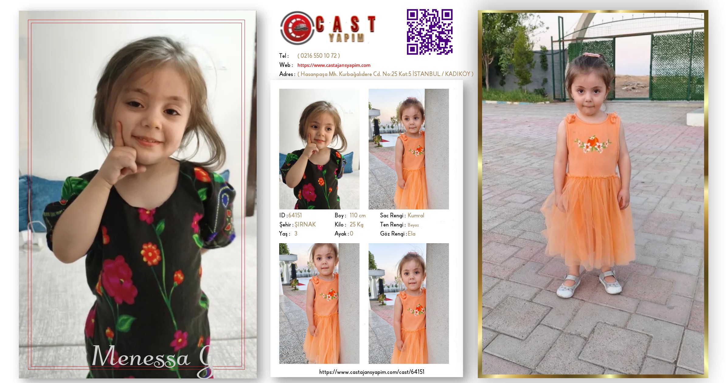 Merhaba, ben Menessa. ŞIRNAK şehrinde yaşıyorum ve 3 yaşındayım. Genel özelliklerim arasında boyum 110 cm, kilom 25 kg, saç rengim Kumral, göz rengim Ela, ten rengim Beyaz.