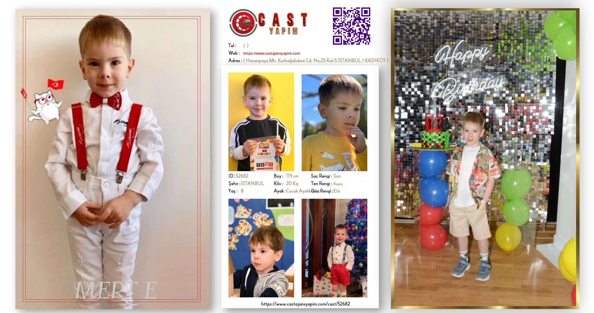 Merhaba, ben MERT E. İSTANBUL şehrinde yaşıyorum ve 8 yaşındayım. Genel özelliklerim arasında boyum 119 cm, kilom 20 kg, saç rengim Sarı, göz rengim Ela, ten rengim Beyaz.