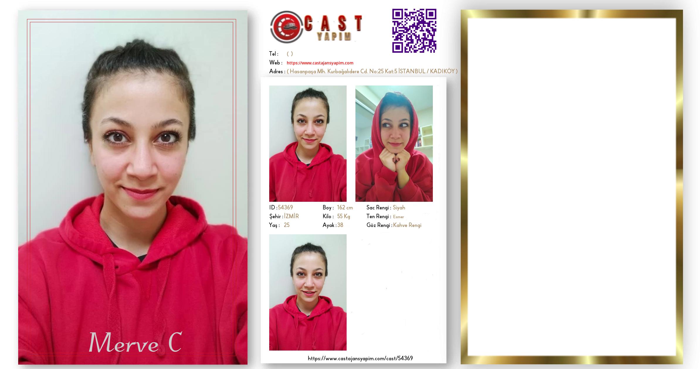 Merhaba, ben Merve C. İZMİR şehrinde yaşıyorum ve 25 yaşındayım. Genel özelliklerim arasında boyum 162 cm, kilom 55 kg, saç rengim Siyah, göz rengim Kahve Rengi, ten rengim Esmer.