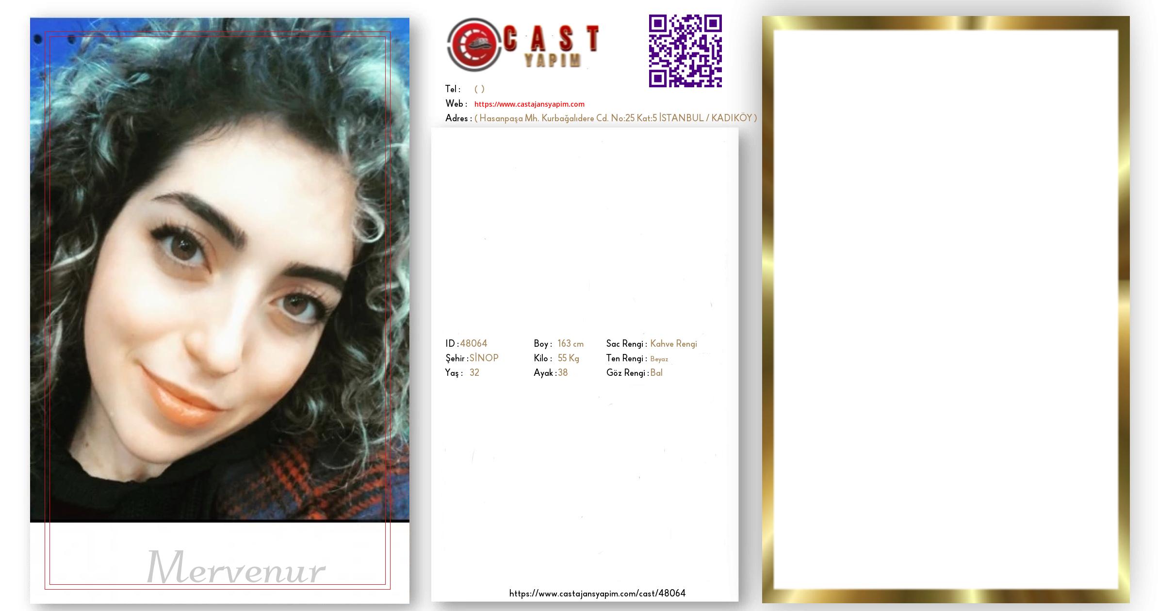 Merhaba, ben Mervenur. SİNOP şehrinde yaşıyorum ve 32 yaşındayım. Genel özelliklerim arasında boyum 163 cm, kilom 55 kg, saç rengim Kahve Rengi, göz rengim Bal, ten rengim Beyaz.