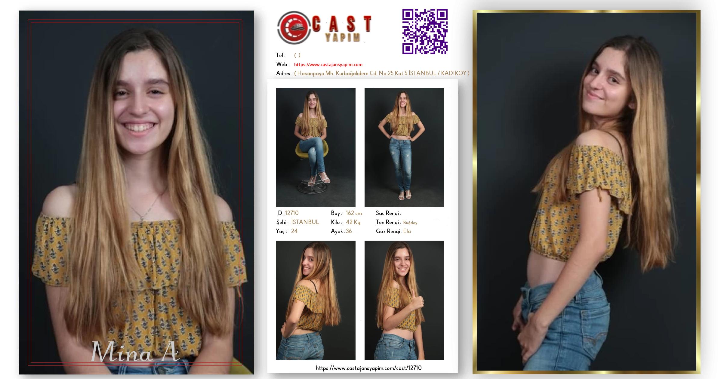 Merhaba, ben Mina. İSTANBUL şehrinde yaşıyorum ve 24 yaşındayım. Genel özelliklerim arasında boyum 162 cm, kilom 42 kg, göz rengim Ela, ten rengim Buğday.