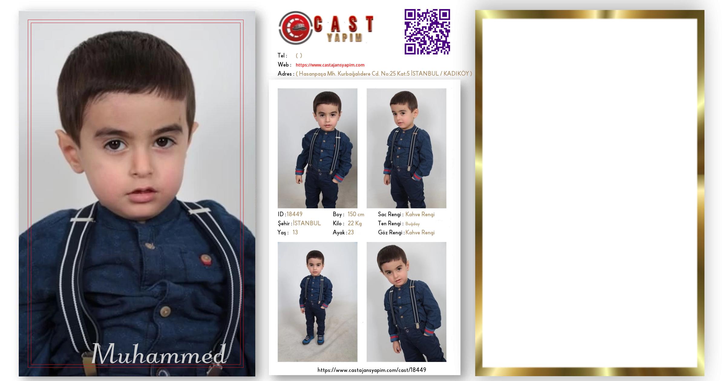 Merhaba, ben Muhammed . İSTANBUL şehrinde yaşıyorum ve 13 yaşındayım. Genel özelliklerim arasında boyum 150 cm, kilom 22 kg, saç rengim Kahve Rengi, göz rengim Kahve Rengi, ten rengim Buğday.