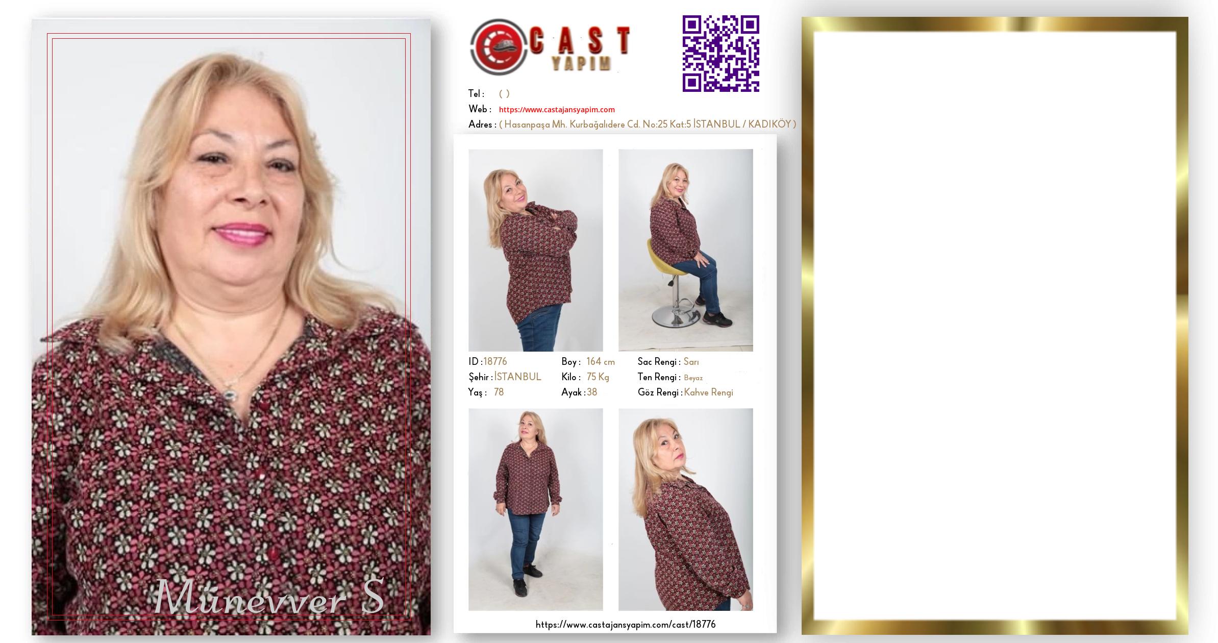 Merhaba, ben Münevver. İSTANBUL şehrinde yaşıyorum ve 78 yaşındayım. Genel özelliklerim arasında boyum 164 cm, kilom 75 kg, saç rengim Sarı, göz rengim Kahve Rengi, ten rengim Beyaz.