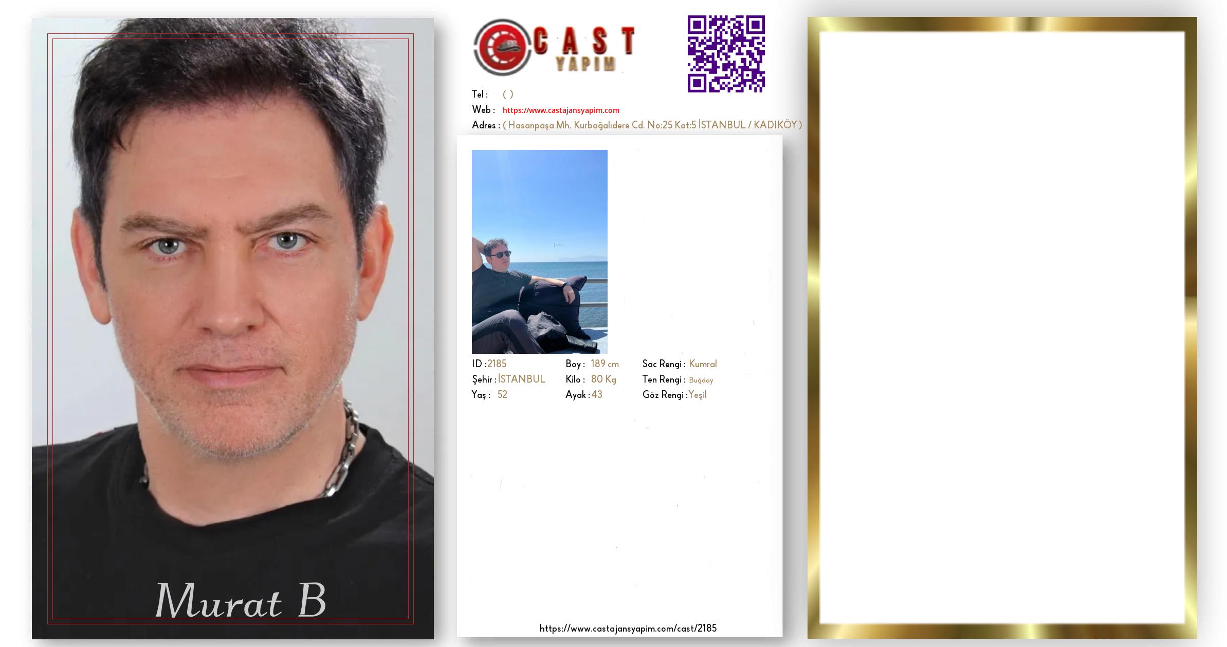 Merhaba, ben Murat B. İSTANBUL şehrinde yaşıyorum ve 52 yaşındayım. Genel özelliklerim arasında boyum 189 cm, kilom 80 kg, saç rengim Kumral, göz rengim Yeşil, ten rengim Buğday.