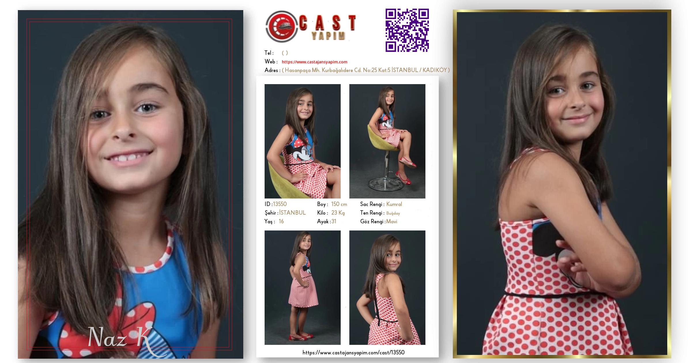 Merhaba, ben Naz K. İSTANBUL şehrinde yaşıyorum ve 16 yaşındayım. Genel özelliklerim arasında boyum 150 cm, kilom 23 kg, saç rengim Kumral, göz rengim Mavi, ten rengim Buğday.