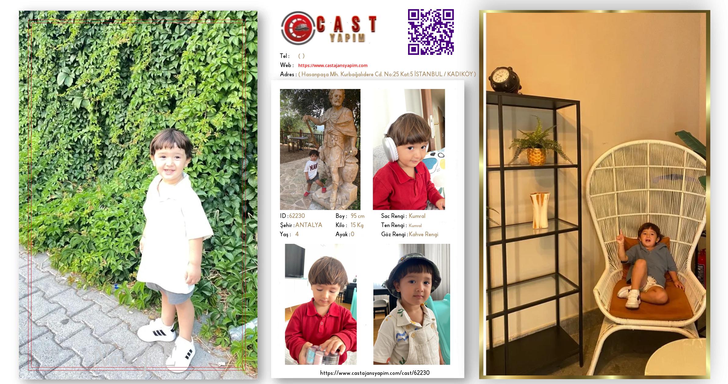Merhaba, ben Nazif E. ANTALYA şehrinde yaşıyorum ve 4 yaşındayım. Genel özelliklerim arasında boyum 95 cm, kilom 15 kg, saç rengim Kumral, göz rengim Kahve Rengi, ten rengim Kumral.