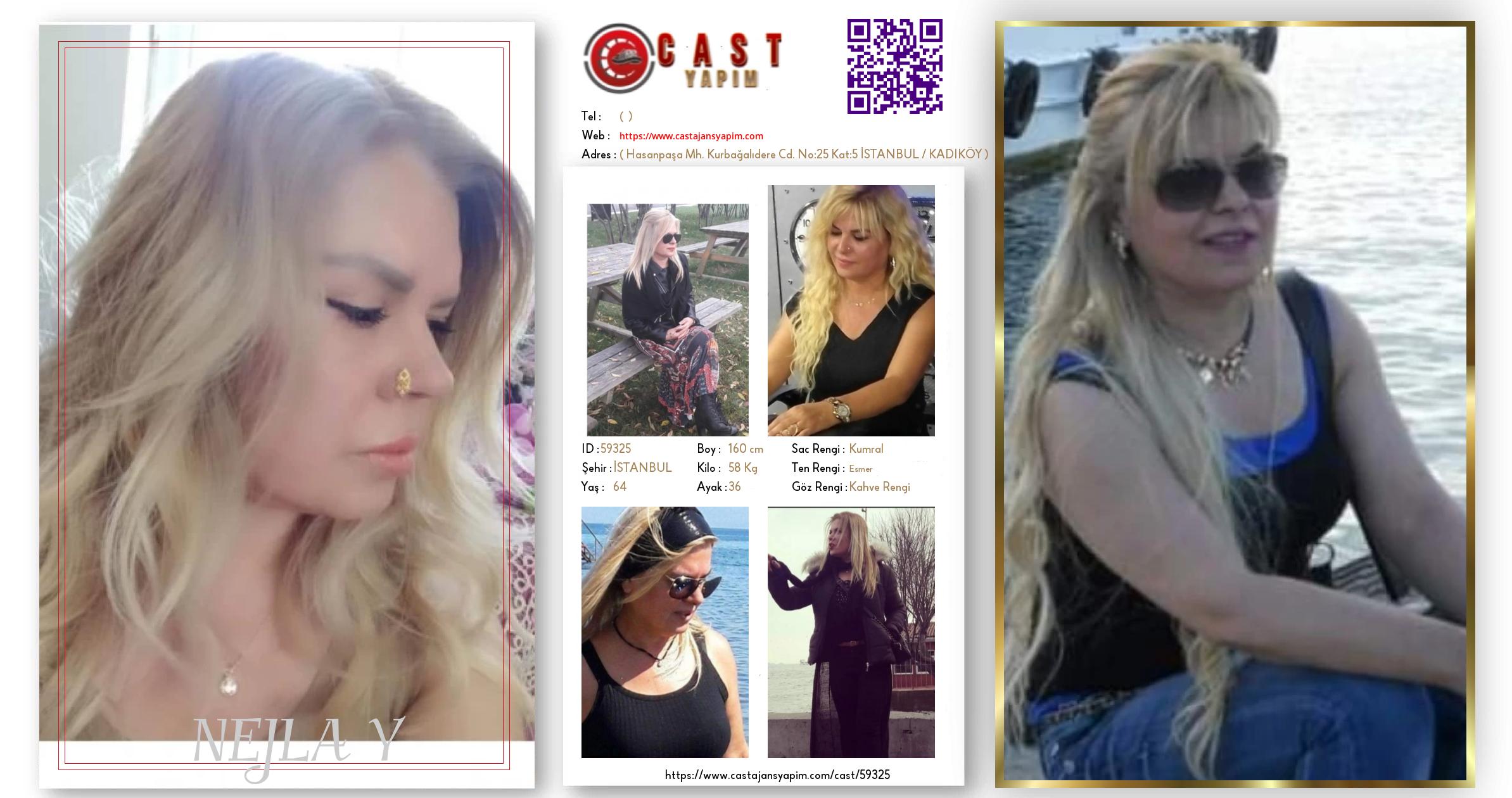 Merhaba, ben NEJLA. İSTANBUL şehrinde yaşıyorum ve 64 yaşındayım. Genel özelliklerim arasında boyum 160 cm, kilom 58 kg, saç rengim Kumral, göz rengim Kahve Rengi, ten rengim Esmer.