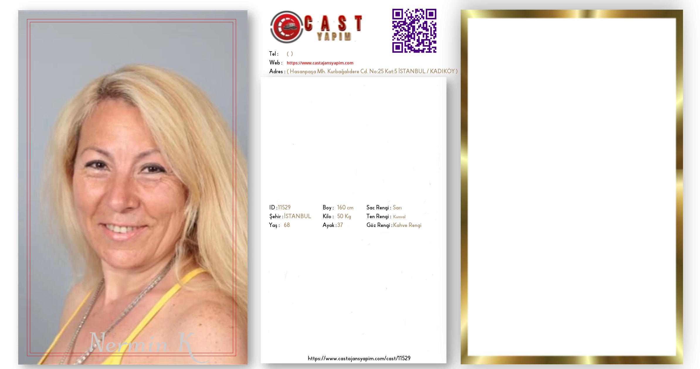 Merhaba, ben Nermin. İSTANBUL şehrinde yaşıyorum ve 68 yaşındayım. Genel özelliklerim arasında boyum 160 cm, kilom 50 kg, saç rengim Sarı, göz rengim Kahve Rengi, ten rengim Kumral.
