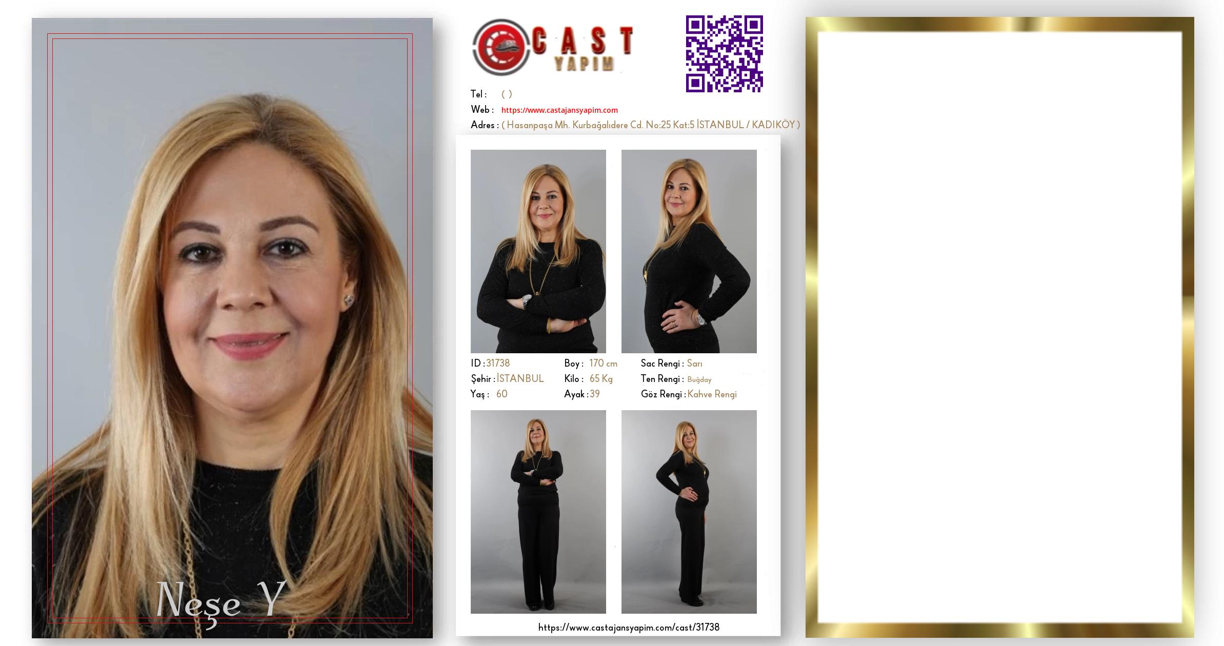 Merhaba, ben Neşe Y. İSTANBUL şehrinde yaşıyorum ve 60 yaşındayım. Genel özelliklerim arasında boyum 170 cm, kilom 65 kg, saç rengim Sarı, göz rengim Kahve Rengi, ten rengim Buğday.
