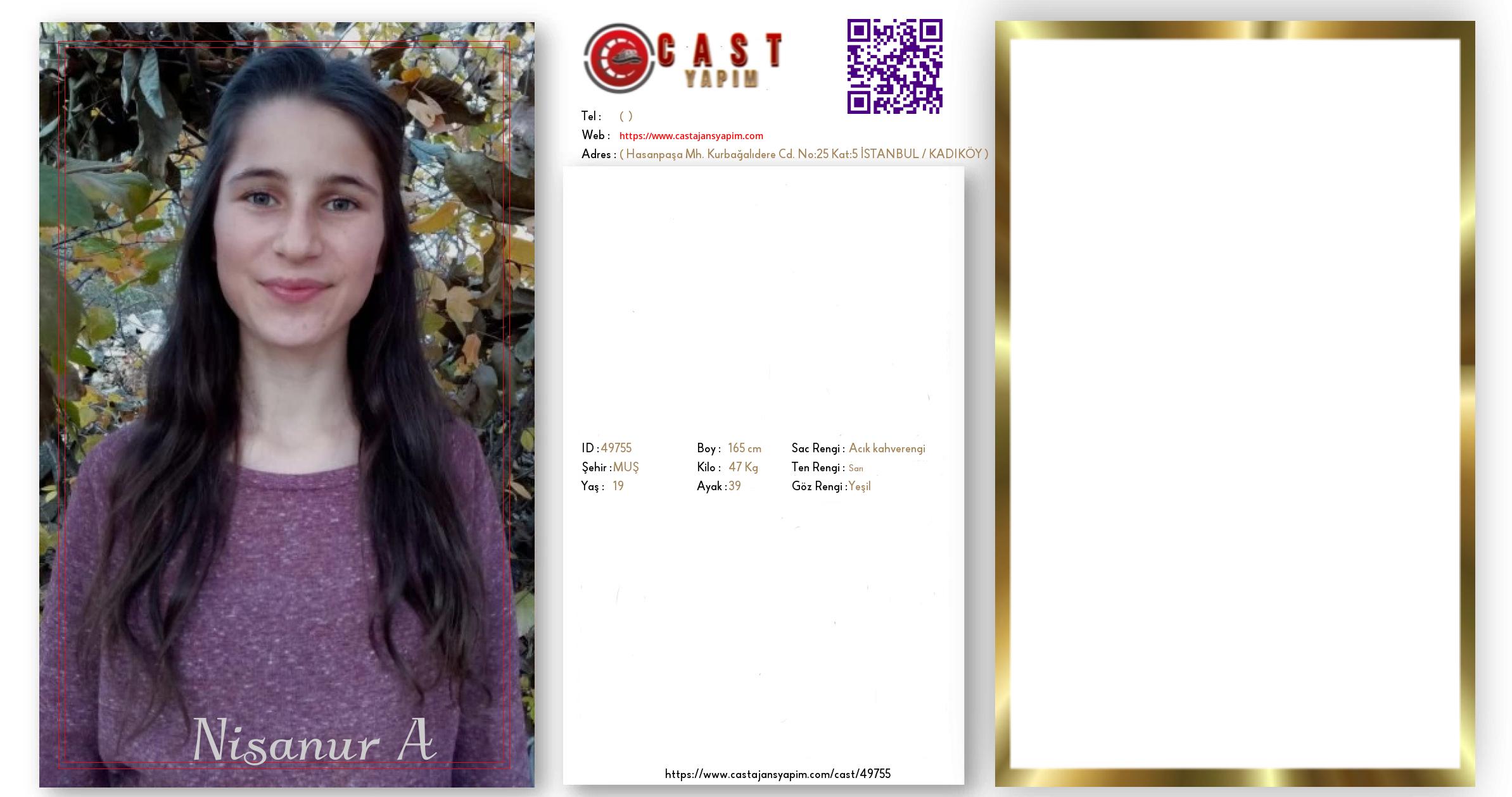 Merhaba, ben Nisanur. MUŞ şehrinde yaşıyorum ve 19 yaşındayım. Genel özelliklerim arasında boyum 165 cm, kilom 47 kg, saç rengim Açık kahverengi, göz rengim Yeşil, ten rengim Sarı.