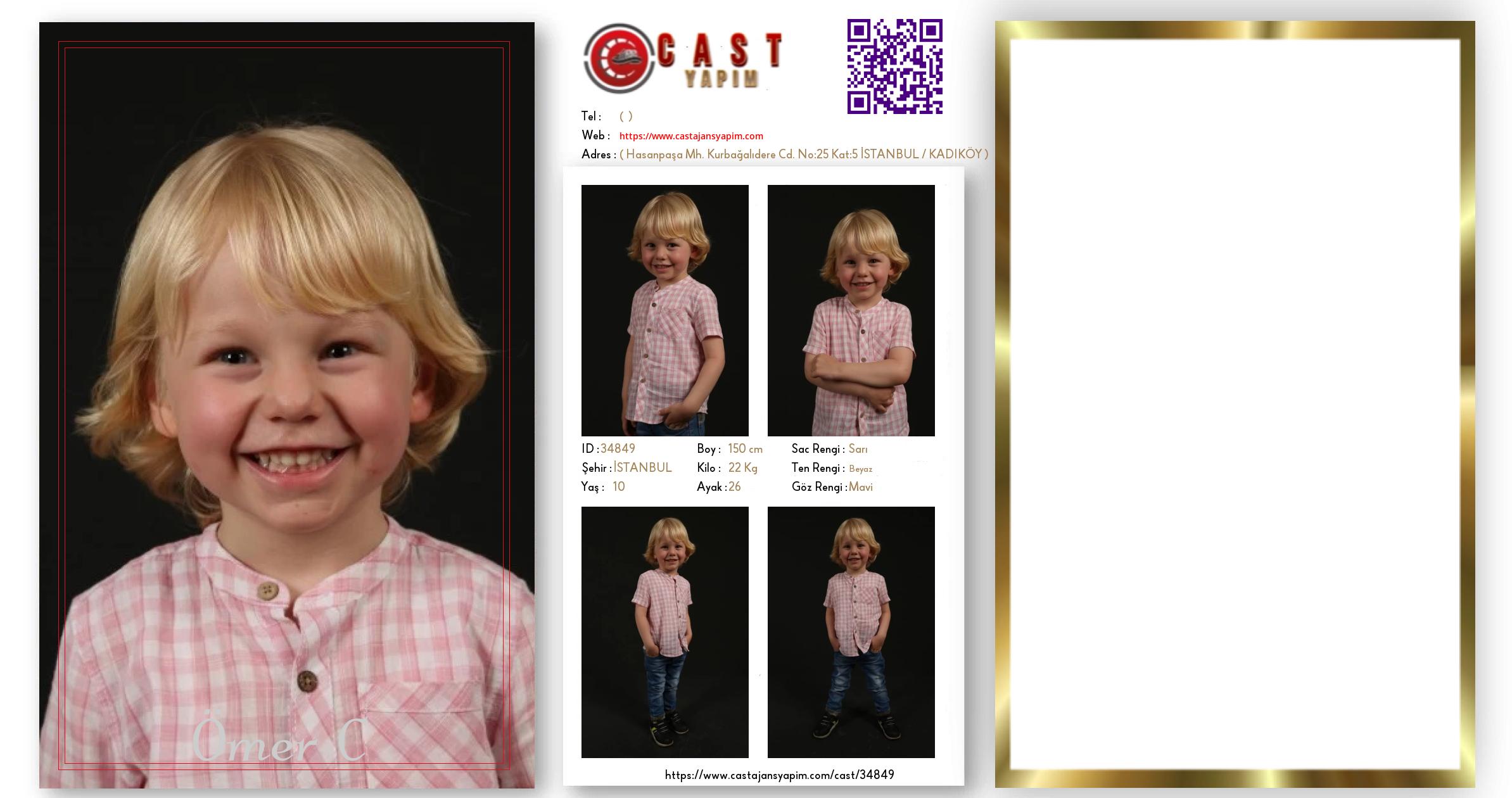 Merhaba, ben Ömer C. İSTANBUL şehrinde yaşıyorum ve 10 yaşındayım. Genel özelliklerim arasında boyum 150 cm, kilom 22 kg, saç rengim Sarı, göz rengim Mavi, ten rengim Beyaz.