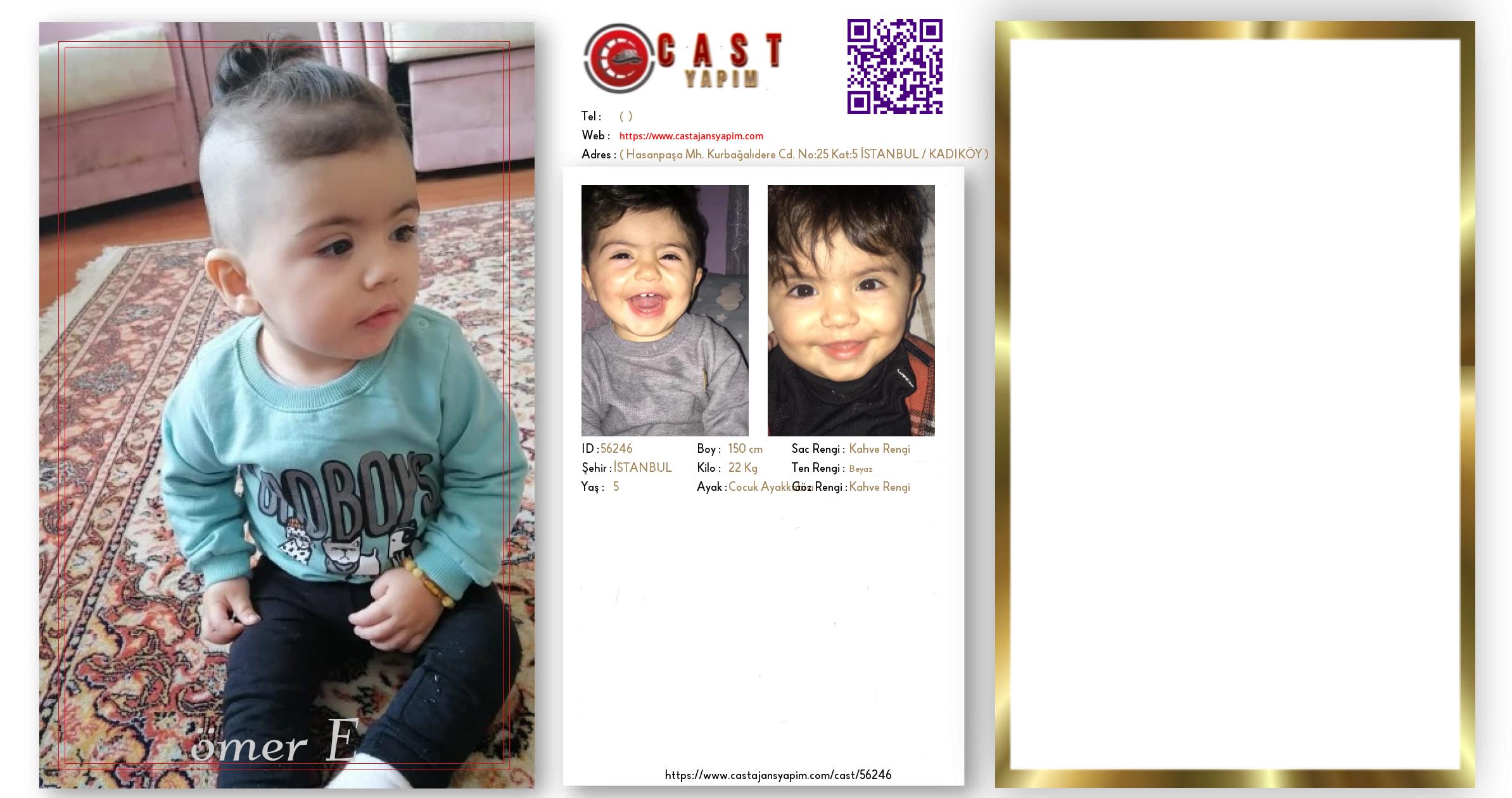 Merhaba, ben ömer E. İSTANBUL şehrinde yaşıyorum ve 5 yaşındayım. Genel özelliklerim arasında boyum 150 cm, kilom 22 kg, saç rengim Kahve Rengi, göz rengim Kahve Rengi, ten rengim Beyaz.
