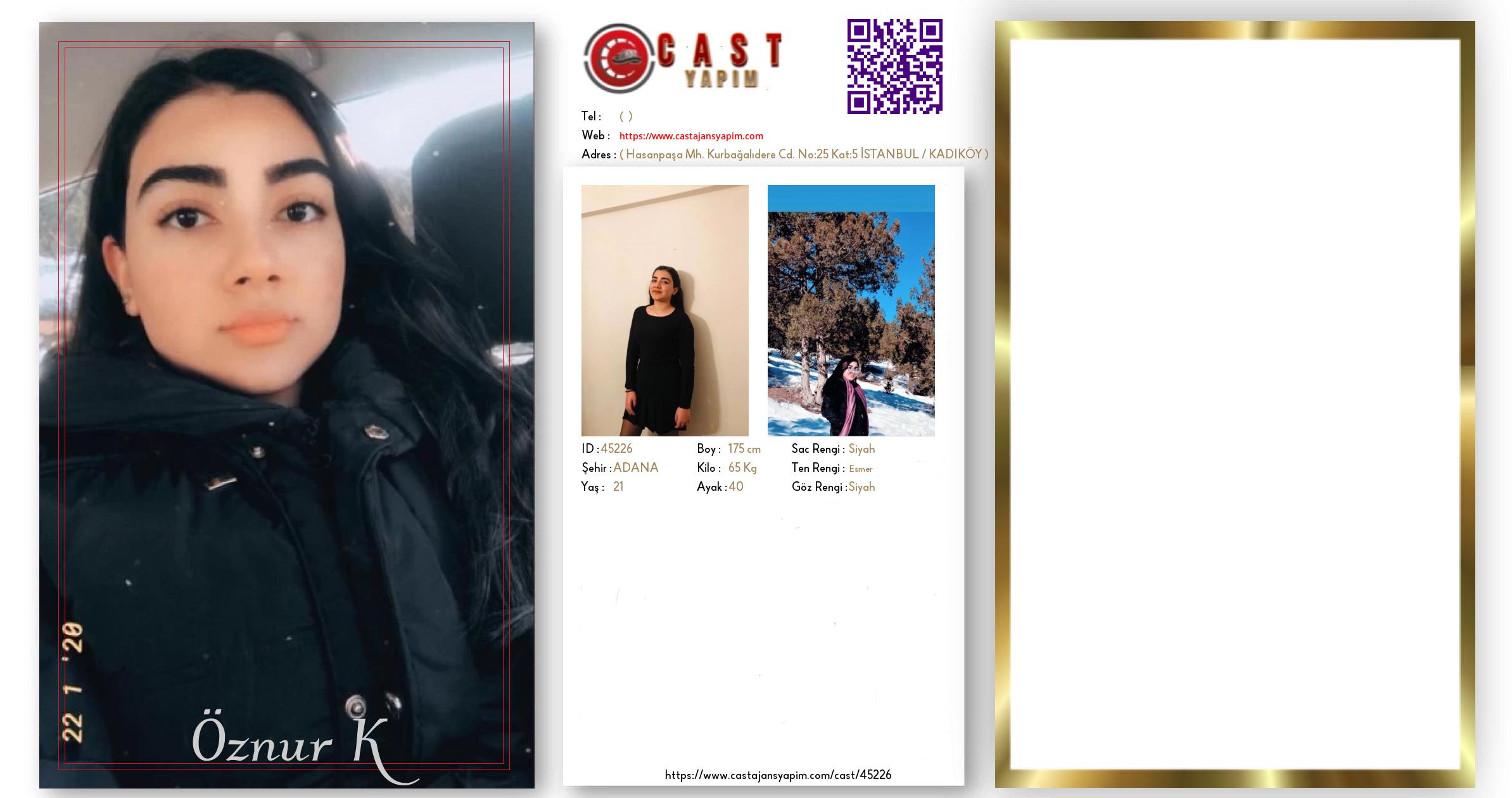Merhaba, ben Öznur. ADANA şehrinde yaşıyorum ve 21 yaşındayım. Genel özelliklerim arasında boyum 175 cm, kilom 65 kg, saç rengim Siyah, göz rengim Siyah, ten rengim Esmer.