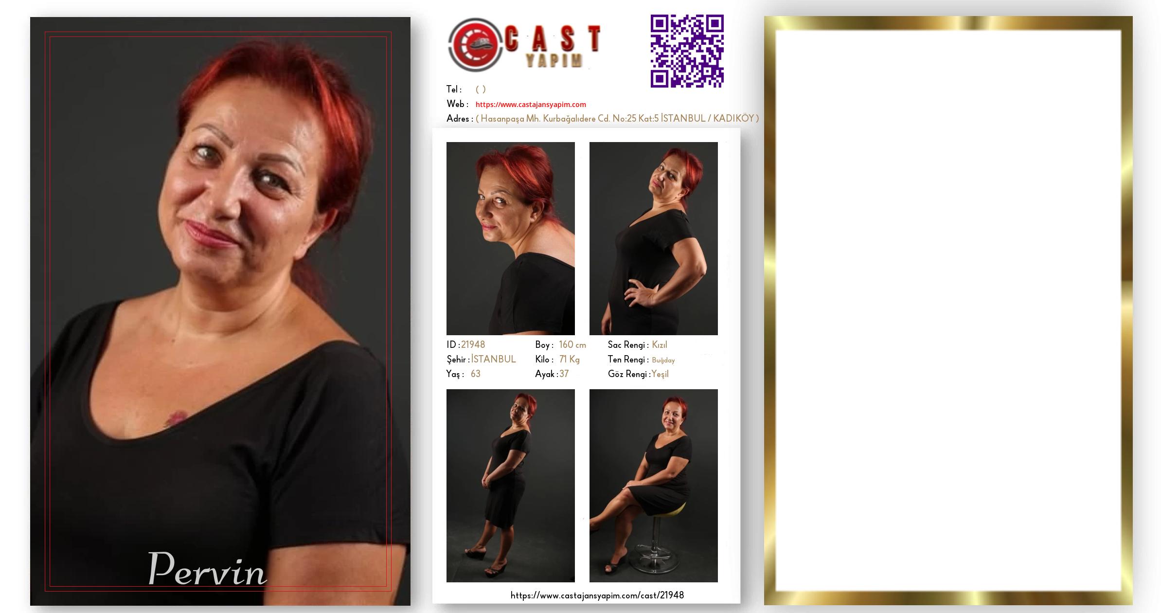 Merhaba, ben Pervin . İSTANBUL şehrinde yaşıyorum ve 63 yaşındayım. Genel özelliklerim arasında boyum 160 cm, kilom 71 kg, saç rengim Kızıl, göz rengim Yeşil, ten rengim Buğday.